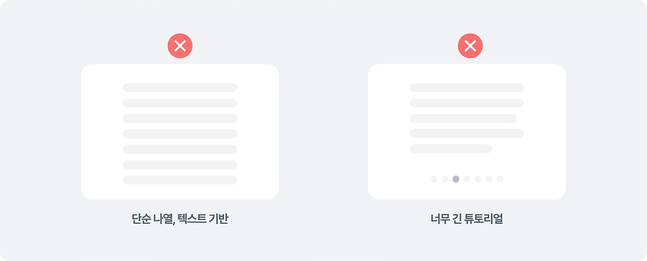 처음 접하는 서비스는 배울 것이 많습니다. 긴 튜토리얼과 과도한 정보는 오히려 사용자의 진입 장벽을 높이겠죠? 핵심 정보만 간결하게 제공하고, 이해를 돕는 시각적 요소(일러스트나 동영상)를 적재적소에 활용하세요. 추가적인 내용이 필요하다면 '더 알아보기'나 도움말로 축약하여 부담을 줄이고요.