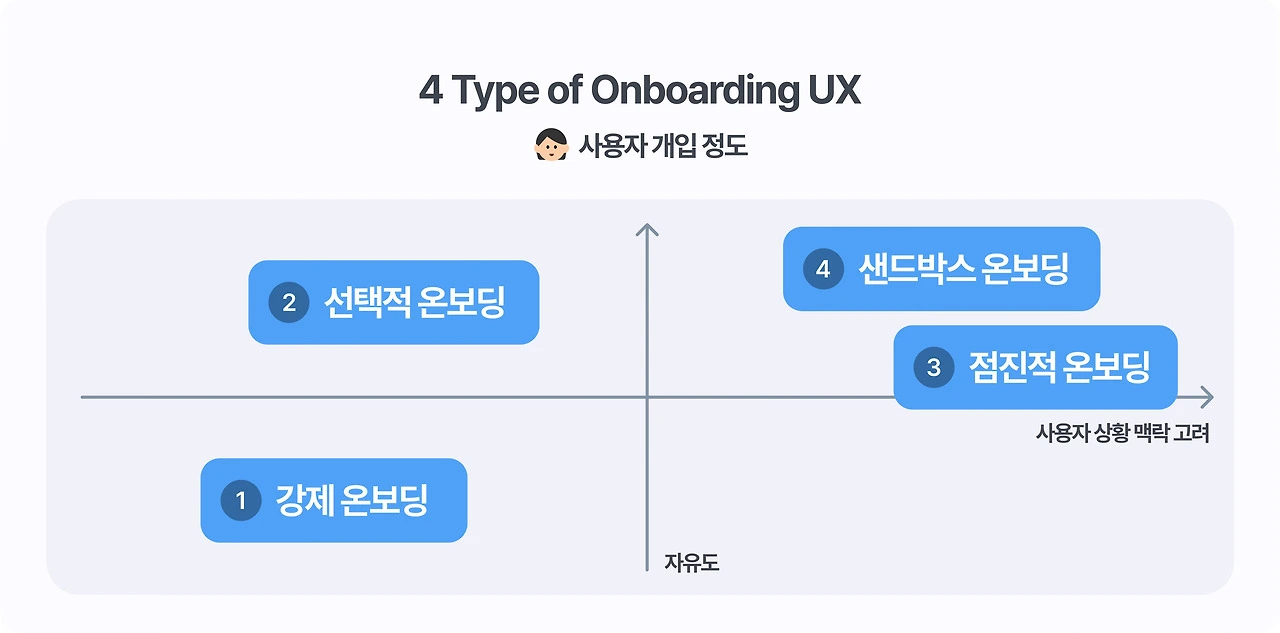 온보딩은 서비스 성격에 따라 다양한 방식으로 설계될 수 있어요. 저는 사용자 개입 정도와 맥락 인식 수준을 기준으로 크게 4가지: 강제 온보딩, 선택적 온보딩, 점진적 온보딩, 샌드박스 온보딩이라는 네 가지 유형으로 분류해보았는데요, 앞서 소개한 UI 패턴들이 각 성격에 맞게 활용되는 식입니다.
