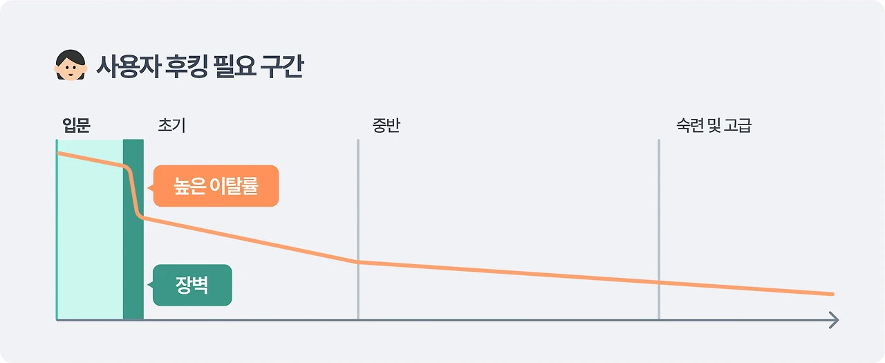 사용자는 탐색할 시간이 부족하기 때문에 온보딩 과정, 즉 [입문] 단계에서 서비스의 핵심 가치를 즉각적이고 직관적으로 전달해야 합니다. 강렬한 첫인상을 주고, 사용자가 '즉시 사용'하도록 유도하는 것이 핵심. 초반에 경험이 시작되지 않으면, 사용자의 관심도가 쉽게 떨어지면서 서비스 리텐션이 급격히 낮아질 확률이 큽니다.
