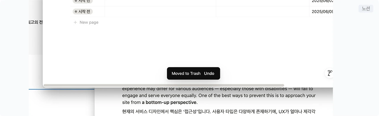 ✅ 노션은 블록을 삭제하는 즉시 다시 복구할 수 있도록 undo 버튼을 제공한다. 삼성 사내 메일에도 이와 비슷한 발송 취소(이미 보낸 메일을 취소할 수 있는)버튼이 있다.