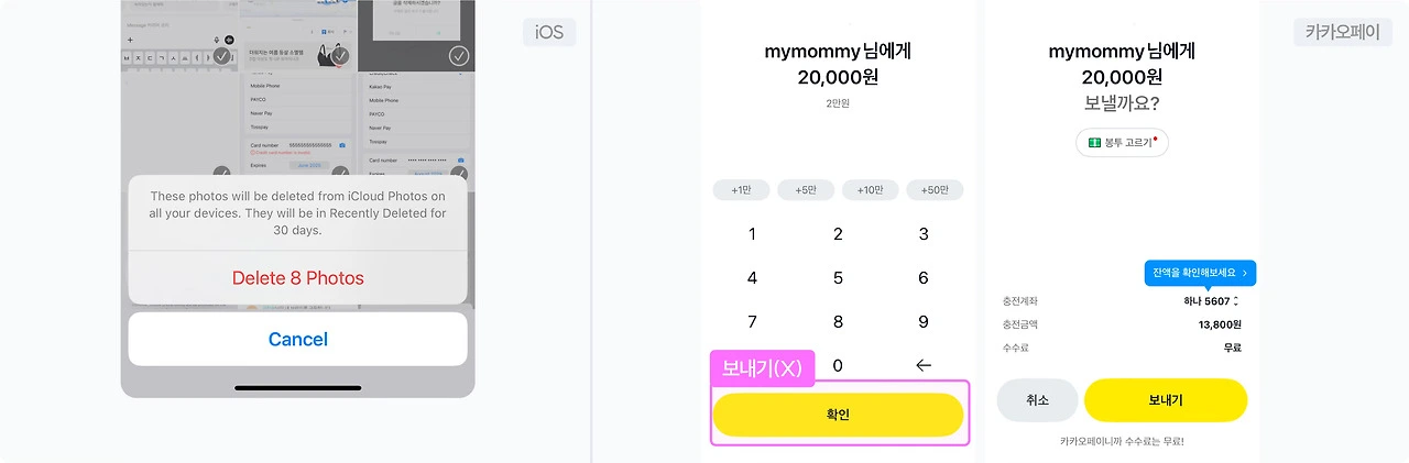 ✅ 거의 모든 OS 및 서비스에서 표준단으로 제공되는 UX. iphone 사진 앱은 "이 사진 24장을 삭제하시겠습니까?"와 같이 삭제 범위를 명확히 안내하는 컨펌 팝업을 띄운다. 금융 서비스의 경우에는 송금 시 금액을 강조하고 이중 버튼을 제공함으로써 실수를 방지한다.