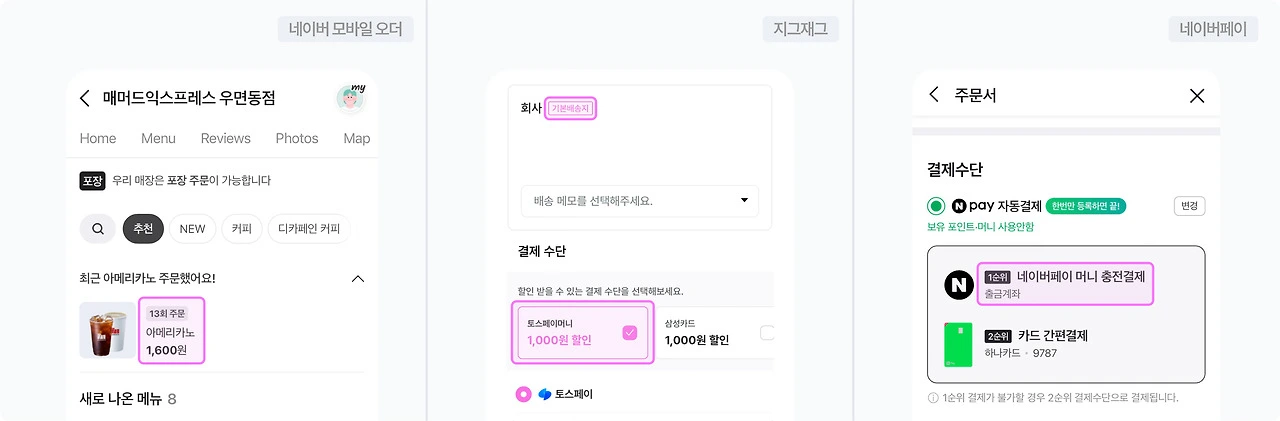 ✅ 네이버의 매장 모바일 오더 서비스는 자주 주문한 메뉴(옵션도 함께 저장)를 상단에 고정해, 반복적인 주문을 빠르고 실수 없이 진행할 수 있도록 돕는다. 커머스 앱에서 배송지가 자동 등록되는 구조도 마찬가지.