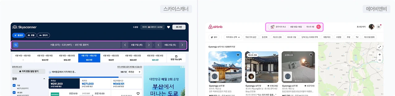 ✅ 예약 시스템에서 쉽게 발견할 수 있다. 스카이스캐너, 에어비앤비 등에서는 사용자가 선택한 날짜/인원 수/필터 조건 등을 상단 바에 고정해 표시해주는데, 덕분에 유저는 현재 예약 조건을 지속적으로 확인하며 실수 없이 예약을 이어나갈 수 있다.
