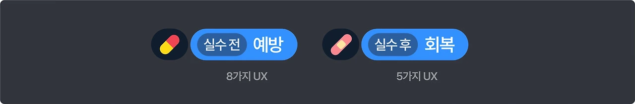 UX에서 실수를 다룰 땐 예방과 회복, 두 방향의 접근이 모두 필요합니다. 어느 하나만으로는 사용자 오류를 온전히 해결할 수 없기 때문이죠. 상황에 맞춰 유기적으로 함께 설계되는 것이 중요합니다.