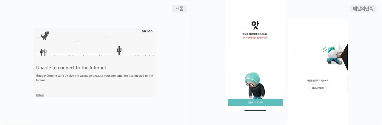 ✅ 구글의 404페이지 (네트워크 연결 실패 시 제공되는 빈 화면)에 삽입된 공룡 게임과 배달의민족의 오류 화면. 재밌고 귀여워서 스트레스가 아주 조금은 완화된다.