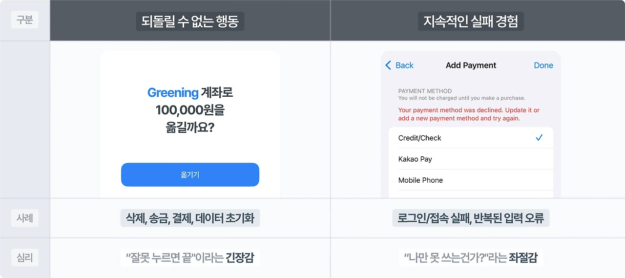 선택에 대한 부담이나 실수에 대한 불안은 특정 환경에서 더욱 증폭됩니다. 대표적으로 되돌릴 수 없는 결과를 감수해야 하는 선택의 순간이나 같은 실수를 반복하게 되는 경험이 그러한데요. 사용자의 심리적 안전감을 무너뜨리고 사소한 선택조차 확신 없이 머뭇거리게 만듭니다.