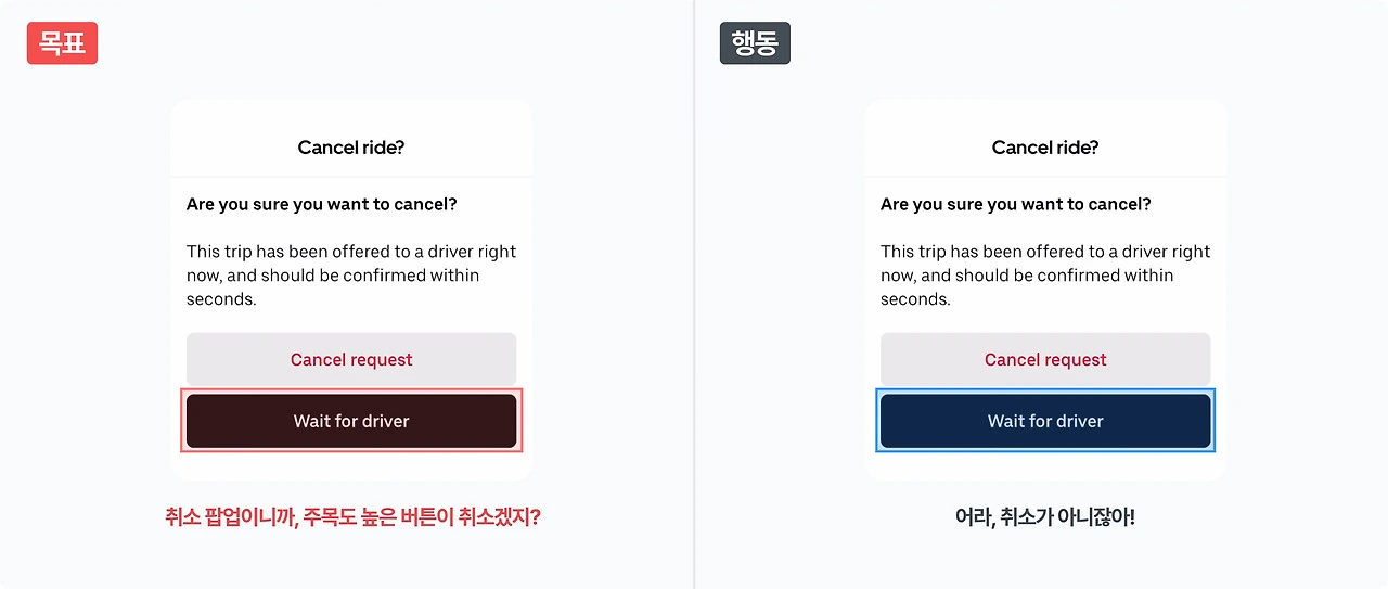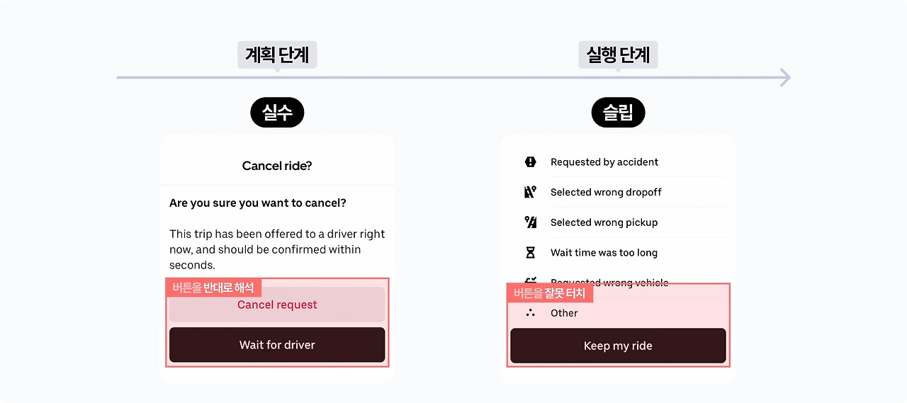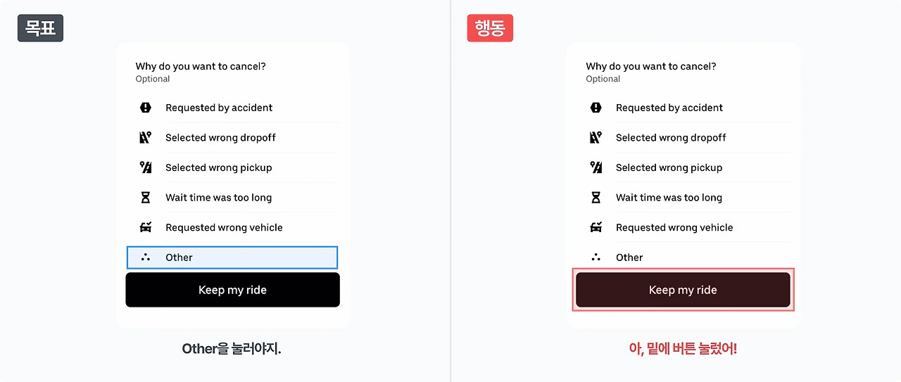 주목도 높게 처리된 버튼을 내가 원하는 주요 액션 버튼이라 오인하고 클릭하는 식입니다. 애당초 목표부터가 잘못됐으므로, '무엇이/왜' 잘못되었는지 정확히 설명하고 다시 이해시키는 과정이 필요한 오류죠. 대개 정보 구조 및 위계 처리가 불분명하거나 표현이 모호할 때 발생합니다.