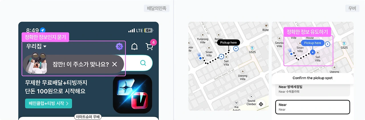 ✅ 배달의민족은 사용자가 가장 최근에 결제한 주소를 기본 배달지로 자동 설정하지만, 현재 위치와 일정 거리 이상 차이가 나면 주소를 다시 확인하도록 유도한다. 우버의 경우, 출발지나 목적지를 입력할 때 모호한 위치가 선택되면 실제 호출 가능한 근처의 명확한 지점을 제안해, 기사와의 연결 정확도를 높인다.