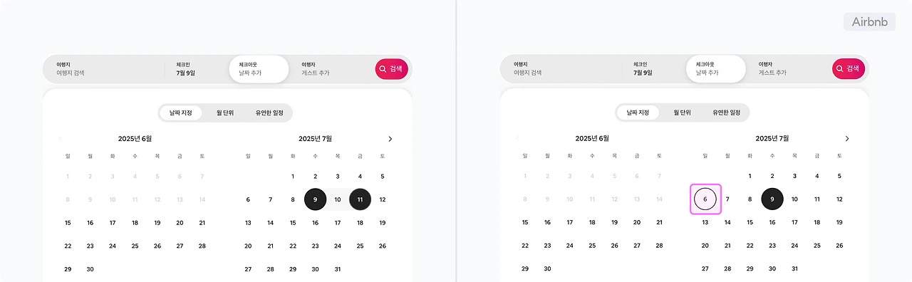 ✅ 항공권이나 숙박 예약 인터페이스에서는 출발일·체크인 날짜를 먼저 선택하게 유도하고, 이후 날짜만 도착일·체크아웃으로 선택할 수 있도록 시각적으로 구분된 컴포넌트를 제공한다. 만약 사용자가 도착일을 출발일 이전으로 선택하면 자동으로 출발일이 해당 날짜로 조정된다.
