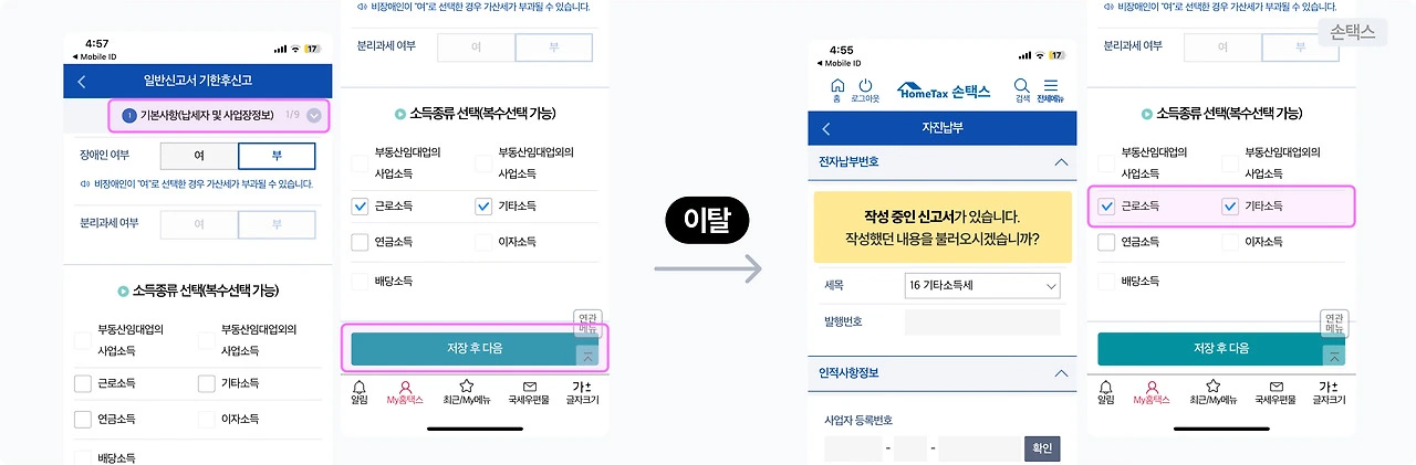 ✅ 회원가입 도중 앱을 이탈해도 다시 돌아왔을 때 이전에 입력한 정보가 그대로 복원되는 경험을 떠올리면 된다. 특히 국세청 손택스 앱이 (다행히도) 이렇게 설계됐다. 5월 종합소득세 신고 때문에 앱을 몇 번이고 들락날락 거렸는데, 로그인을 다시 해도/이틀이나 뒤에 들어가도 작성한 내용이 그대로 살아있어 감격스러웠던 경험. 공공기관 앱이라 기대 안했거든요.