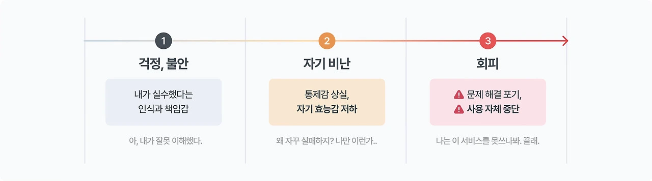 오류는 단순한 기능 실패가 아닙니다. 사용자에게 제어감 상실과 복구 불가능성에 대한 불안을 느끼게 만드는 요소죠. "이걸 되돌릴 수 없으면 어떡하지?"라는 공포, "내가 이 상황을 제어하지 못하고 있다"는 무력감, "나는 이 서비스를 제대로 사용할 수 없는 사람인가봐"라는 자기 비난으로까지 순식간에 확장됩니다.