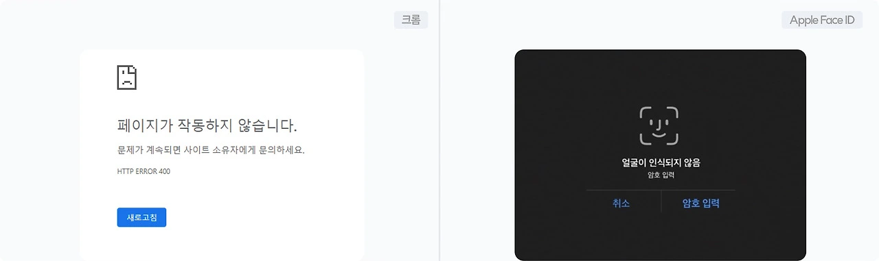 ✅ 크롬의 새로고침 버튼과 애플의 Face ID 대신 암호 입력하기 버튼. 보통 Face ID를 연속 2~3번 실패하면 암호를 직접 입력할 수 있는 숫자 패드가 자동으로 제공된다.