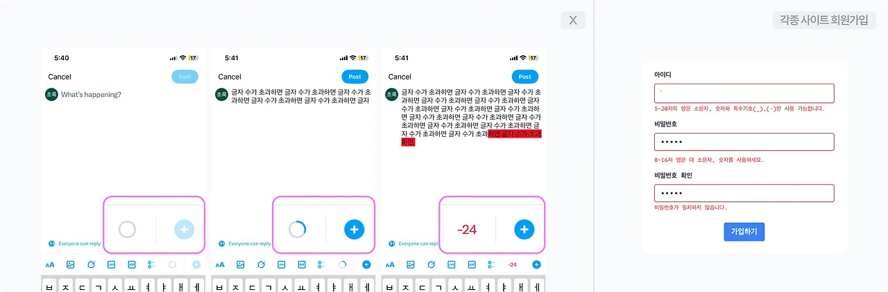 ✅ 트위터처럼 글자 수 제한이 있는 입력폼은 남은 글자 수를 실시간으로 표시하며 초과시 빨갛게 처리한다. 회원 가입 과정에서도 입력한 정보가 조건을 미달했을 시 즉시 아래에 붉은 경고를 노출한다. (e.g. 특수문자 1개 이상 포함해야 합니다)