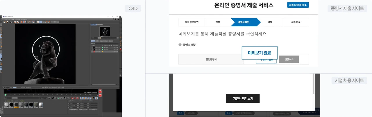 ✅ 영상 편집 툴에서 제공되는 '렌더링 미리보기' 기능. 보통 렌더링은 짧아도 수 분, 길게는 수십 분이 소요되기 때문에 실수가 없는지 점검해봄으로써 불필요한 시간 낭비를 줄인다. 기업 서류 제출 플랫폼도 마찬가지. 지원자가 입력한 내용을 실제 제출 형식으로 변환한 미리보기 화면을 제공해주고 있다.