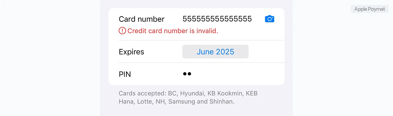 ✅ 애플 결제 수단 등록 과정에서 제공되는 에러 메시지. 유효하지 않는 번호라는 등 문제점을 명확히 안내한다.