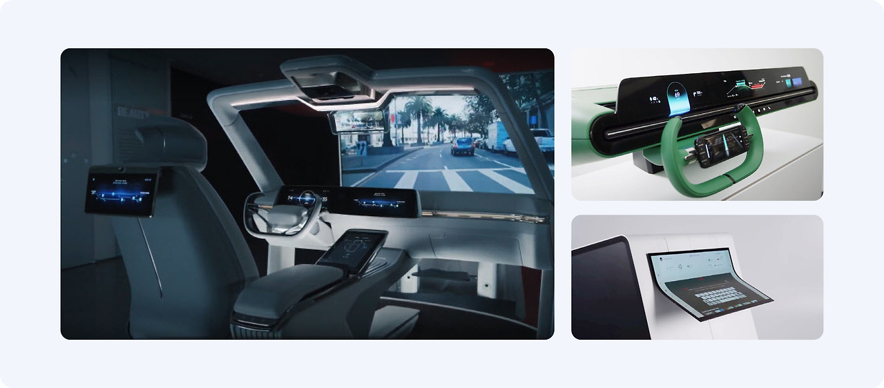 LG전자가 제안한 Concept Car을 살펴볼까요. LG는 자동차를 '개인화한 디지털 공간'으로 재정의합니다. 자동차는 더 이상 단순 운송 수단이 아닌, '사용자가 놀고, 머물고, 일하는 [나만의 공간]이 된다'는 비전입니다. LG 전자의 강점인 디스플레이에 인공지능을 결합함으로써, 고객 니즈에 맞춰 변형 가능한 차량 공간 경험을 제안했어요.
