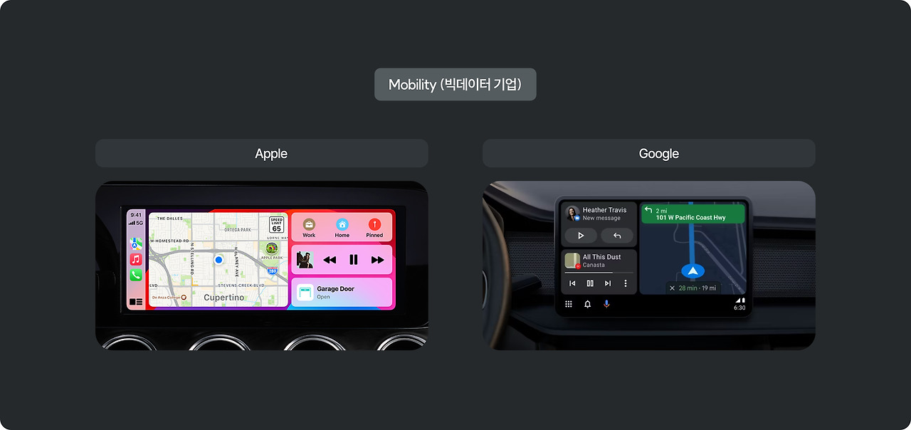 빅데이터 기업들도 주목하는 산업으로, Apple: Car play와 Google: Android Auto 대표적 케이스