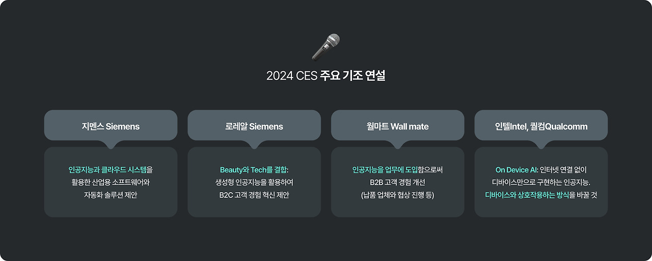 CTA 게리 샤프로는 "모든 산업 분야에 AI 기술이 적용된다" 말했습니다. 생성형 AI가 출현한 이후, AI는 영역을 가리지 않고 모든 곳들에 스며들고 있어요. 2024 CES 기조 연설 라인업과 내용만 봐도, 올해 테크 트렌드 핵심이 무엇이며 어떤 방향으로 나아갈지 짐작할 수 있습니다.