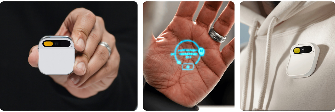 브로치 형태의 AI 디바이스 핀으로, 초소형 웨어러블 디바이스입니다. 레이저 프로젝트를 활용하여 사용자 손바닥이나 주변 물체의 표면에 최대 40cm의 디스플레이를 투사합니다. 메인 조작 방식은 음성이고, 손동작을 카메라가 인식하거나 터치패드가 있는 기기를 터치하는 방법으로도 조작 가능합니다. 해당 디바이스는 자체 AI 에이전트가 아닌, 오픈 AI GPT 4를 활용하고 있습니다.