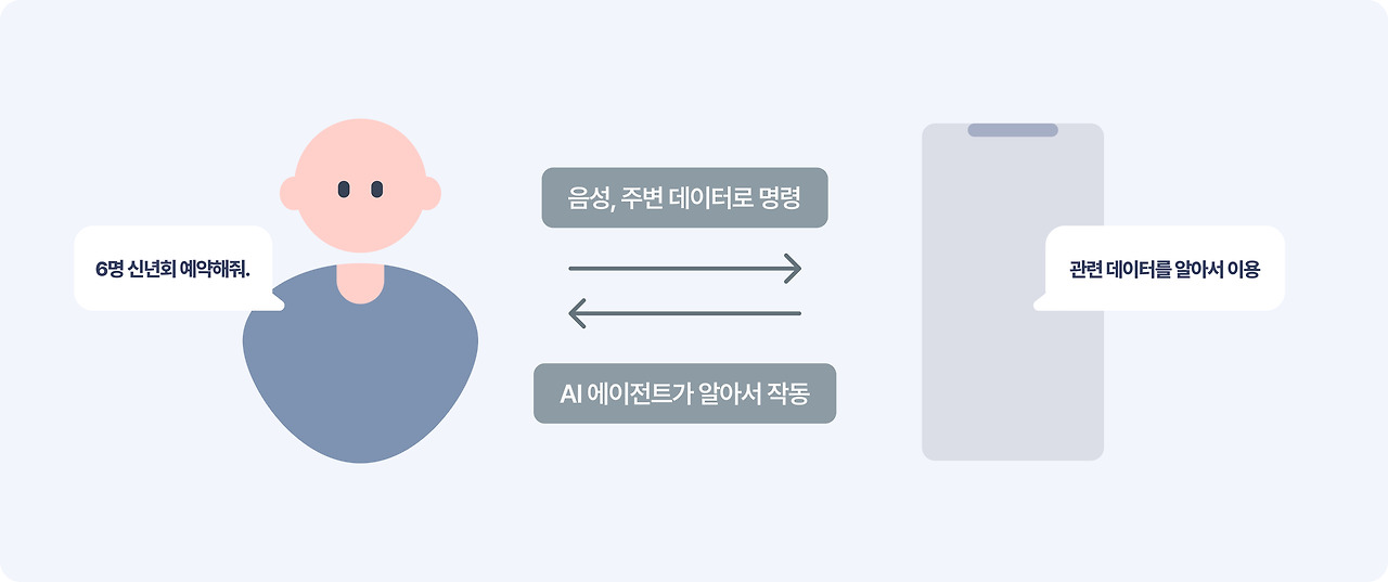 예를 들어 여러분들이 친구들과 신년 모임을 계획 중에 있다 가정해봅시다. 그렇다면 지도 앱을 켜서 식당을 찾아보고, 식당 예약 앱으로 예약 가능 일자를 확인한 뒤, 메신저로 친구들과 일정을 조율합니다. 일정이 픽스되면 다시 식당 앱을 이용해 예약할테고요. 보기만 해도 번거로운 이 과정을 이제는 AI 에이전트가 알아서, 쉽게 해줄겁니다. 그저 "어떤 친구들과 신년회를 하려는데, 6명이 갈 수 있는 식당을 예약하고 관련 정보를 누구누구 친구들에게 보내줘."라 요청하면 끝이죠.