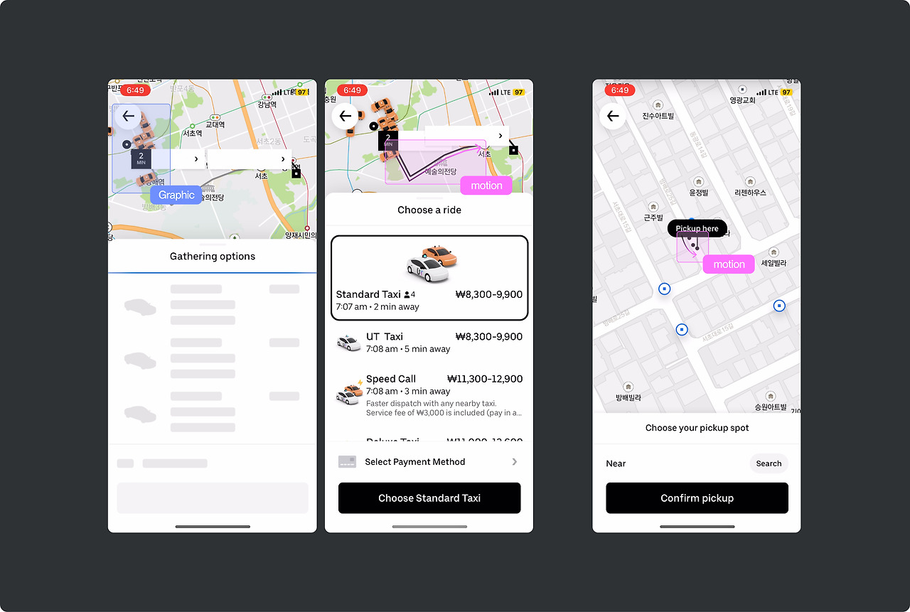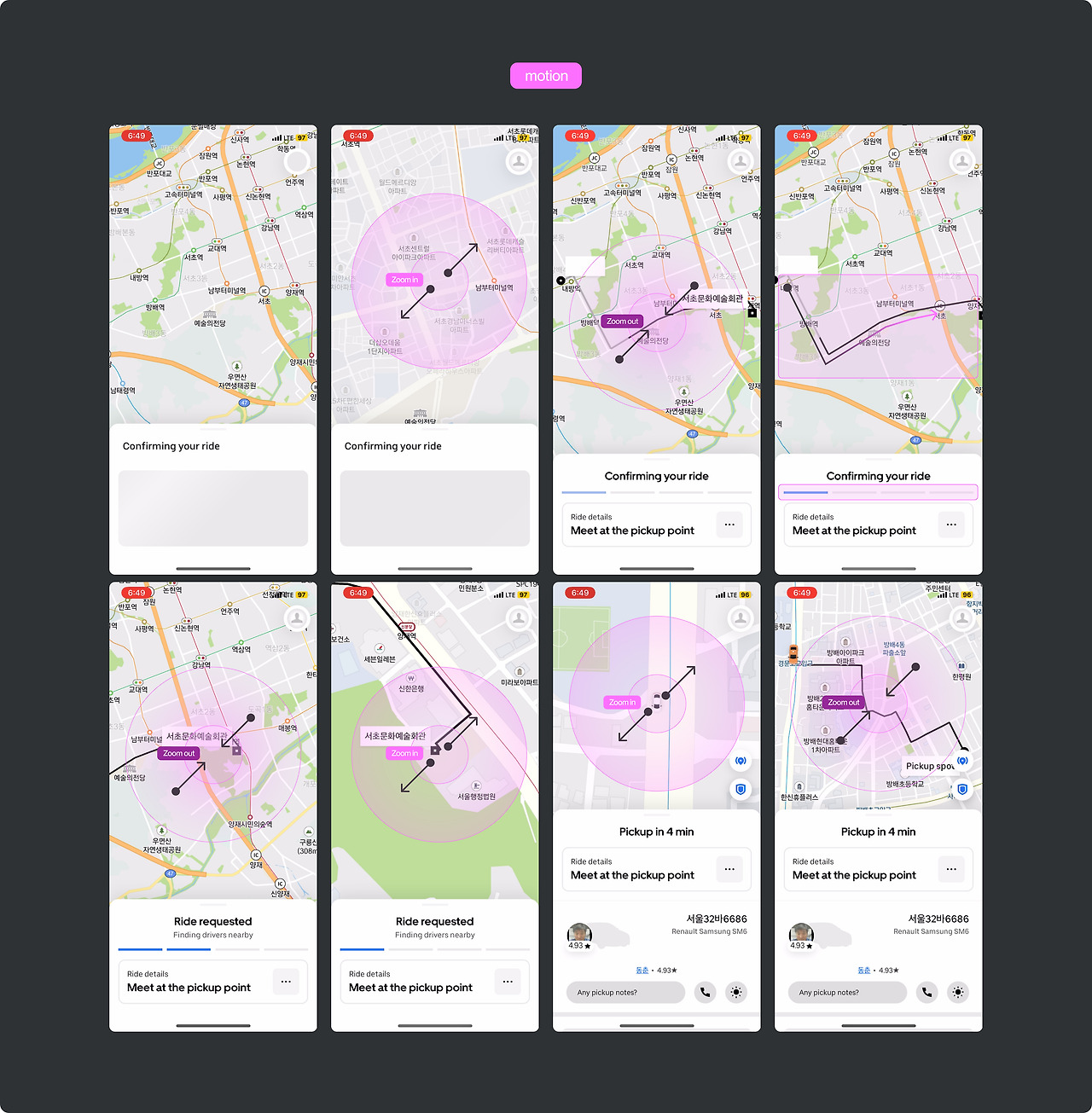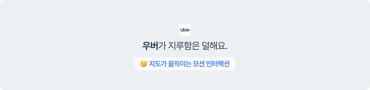 그래도 우버의 GUI 모션은 흥미롭습니다. 우버를 사용해 보신 분들은 아실 텐데, 기사님을 연결할 때 위에 보이는 지도가 줌 인아웃 되더라고요. 꼭 필요한 인터랙션은 아니지만, 그래도 택시를 기다리는 지루함이 조금은 덜어지는 효과가 있는 것 같아요.