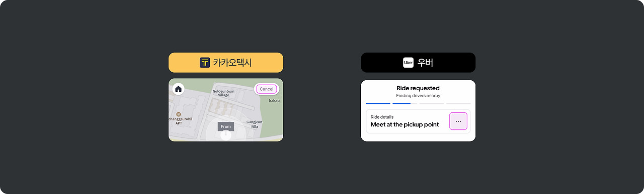 통상적으로 [···] 아이콘을 누르면 = [관련 메뉴 / 생략된 추가 정보]가 나온다입니다. 그래서 [택시 안내 메시지 옆에 있는 말줄임표 버튼]이니까 [관련한 택시 정보나 취소 기능]이 나오겠거니 추측할 순 있어요. 하지만 취소처럼 사용자에게 꼭 필요한 기능은 추측해 찾는 것이 아닌, 쉽게 발견하고 누를 수 있어야 합니다.