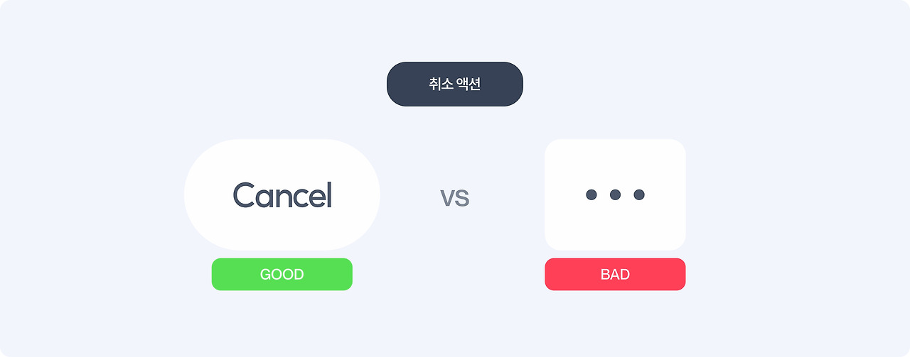 말줄임표 버튼에는 [지금 당장에는 필요하지 않은, 추가 액션]들을 모아두기에 더욱 그렇습니다. 취소는 해당 과정에서 [당장 필요한, 핵심 액션]입니다. 따라서 굳이 말줄임표 아이콘이 그려진 버튼으로 숨겨둘 필요도, 그래서 취소 버튼을 찾는 과정을 한 뎁스 늘릴 필요도 없죠.