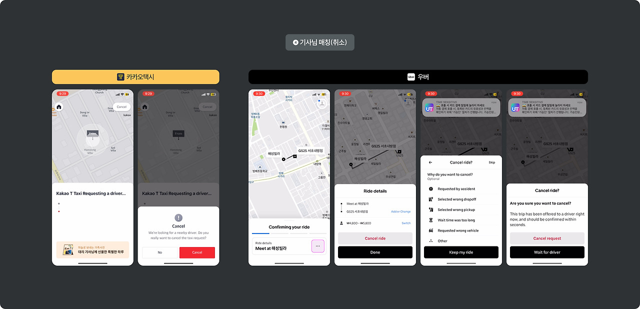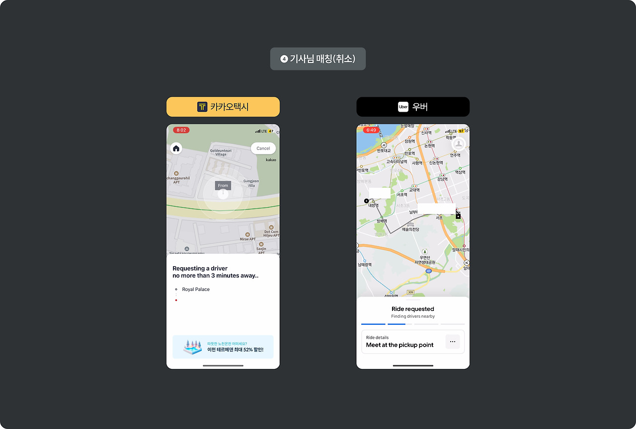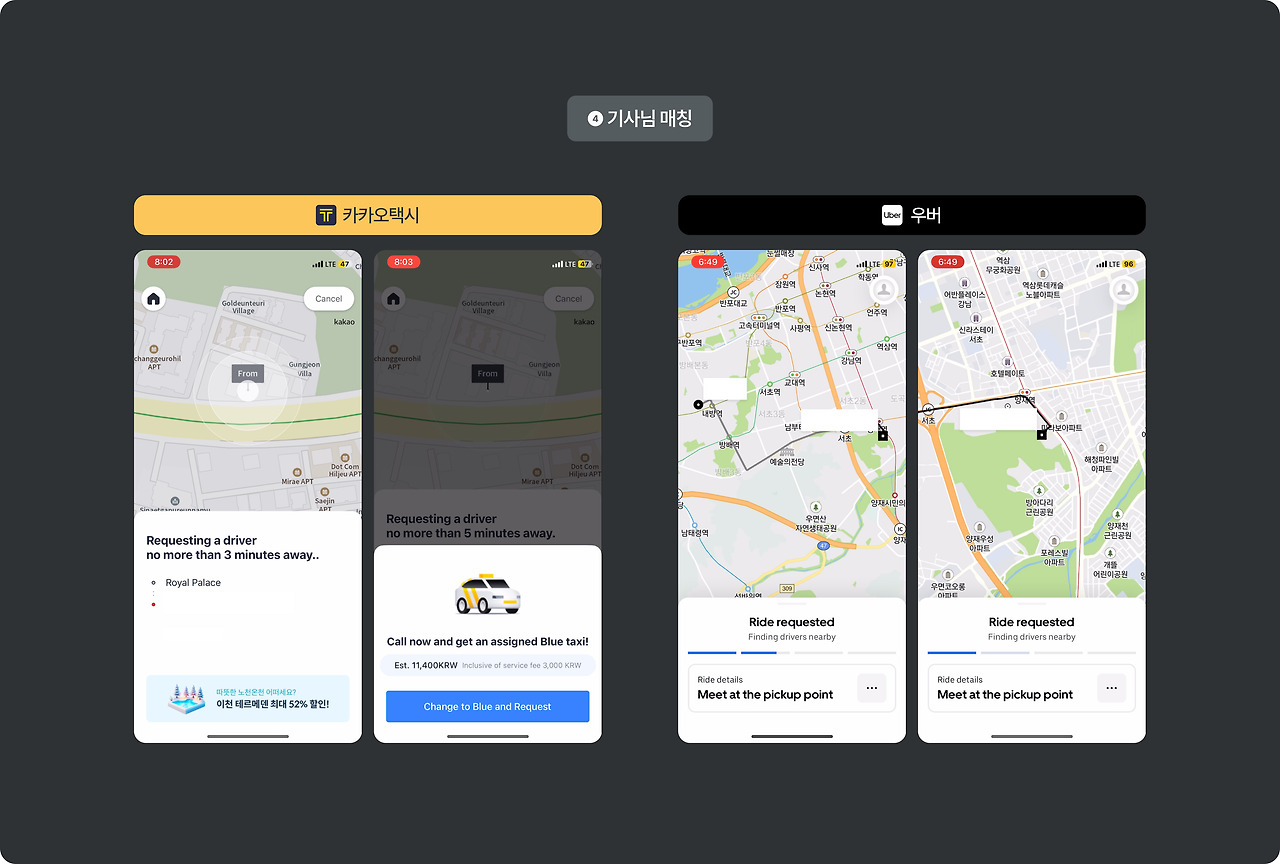 택시 서비스를 애용하며 느꼈던 UX/UI 차이 및 분석 2편입니다. 이번 글에서는 ❹기사님 매칭, ❺배차 성공 후 대기) 플로우 별 UX/UI 차이점을 다루고, 우버의 GUI에 대한 이야기도 나눠보려 해요.
