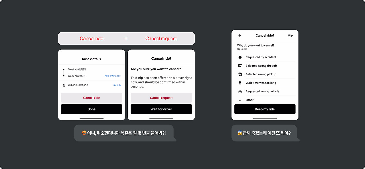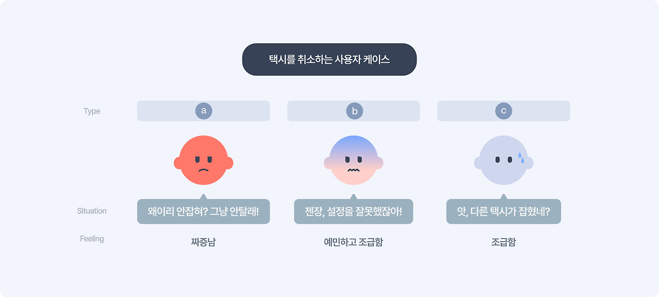 취소 과정을 이렇게 상세히, 그리고 비판적으로 다룬 이유는, 해당 프로세스에 놓인 사용자의 경우 부정적인 감정(불편함, 화남, 짜증남 등)을 더 쉽고 빠르게 느낄 것이기 때문인데요. 시나리오상 택시를 취소하는 사용자는 보통 다음과 같은 케이스일 겁니다.