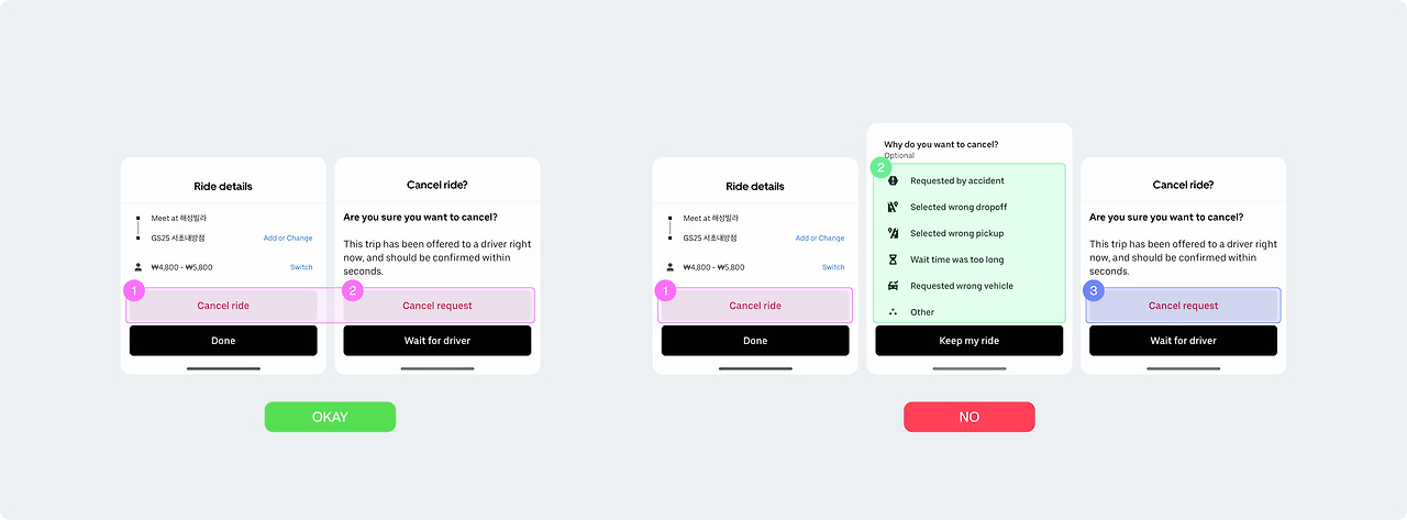취소 버튼을 찾기 어려운 것도 문제지만, 취소로 가기까지의 뎁스가 필요 이상 긴 것 또한 큰 문제입니다. 카카오택시는 '정말 취소를 할 것인지' 확인하는 바텀 시트만 지나면 끝납니다. 하지만 우버는 어떤가요?