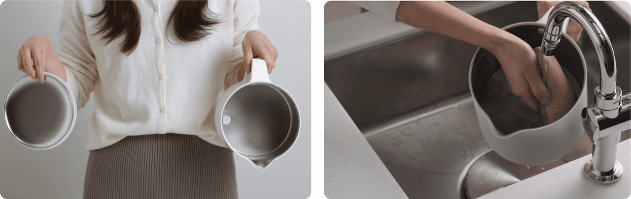 디자인도 디자인이지만, 가장 눈에 띄었던 부분은 바로 간편한 세척구조였습니다. 흔히 가습기하면 '세척이 어렵고 번거롭다'는 생각이 들잖아요. 그런데 n% 가습기는 사진과 같이 (좌)단 두 개의 부품으로 구성되어 있고, (우)그릇처럼 물로 닦으면 끝이라 이용하기 쉬울 것 같더라고요. 사용자가 가습기를 이용할 때 어떤 점을 불편해하는지 잘 파악한 제품이라 느껴졌습니다. 이렇게 쓰니 정말 광고글 같은데 진정 UX 측면으로 느낀 소감이자 칭찬입니다.