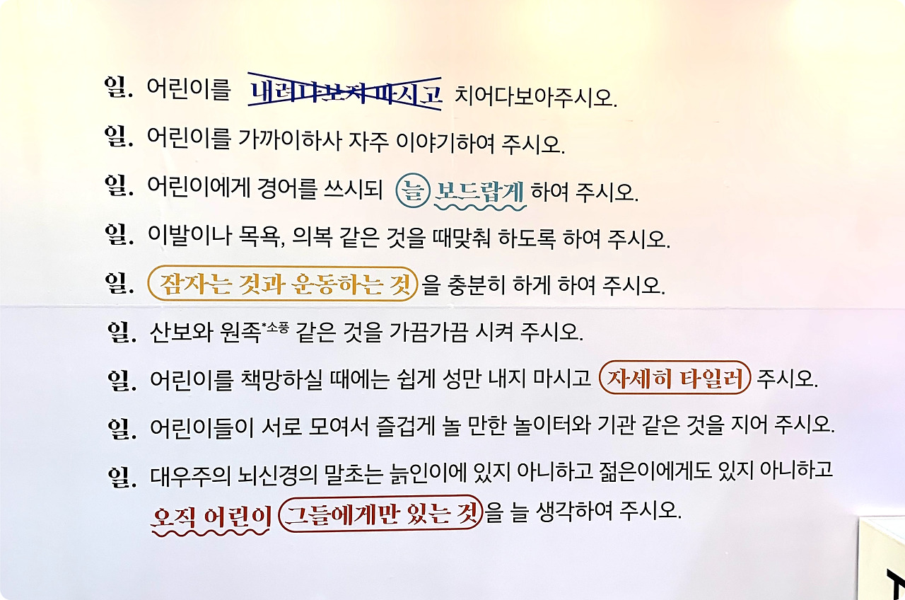 마지막은 따뜻했던 어린이 사회인식개선 캠페인. 방정환 선생님이 작성했던 어린이 선언이 벽에 붙어있었습니다. 저도 어린이 하고 싶네요. 저를 책망하실 때에는 쉽게 성만 내지 마시고 자세히 타일러주시고요.. 저랑 제 친구들이 서로 모여서 즐겁게 놀 만한 놀이터와 기관 같은 거 지어주시구요.. 잠자는 것과 운동하는 것 충분히 하게 해주세요.. (제발)