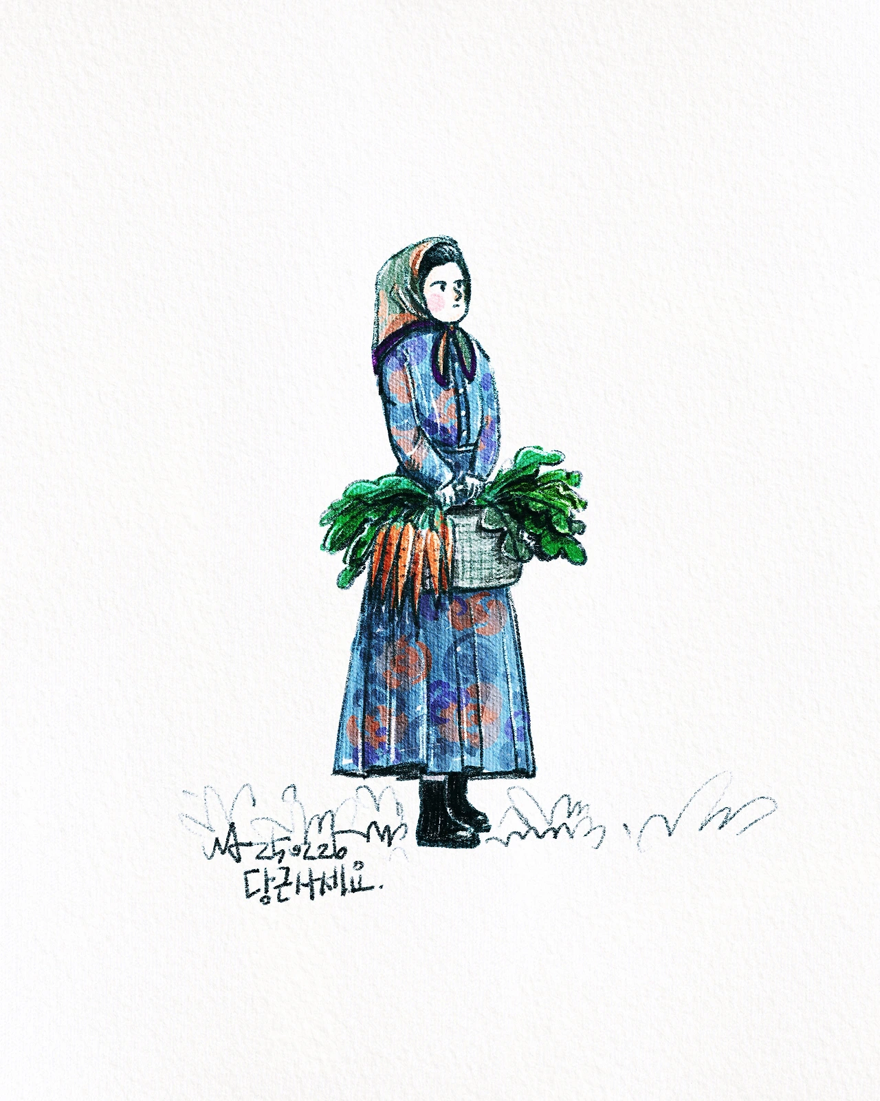 ”아가씨. 그 당근 맛있어 보이는데 내게도 팔아요.”