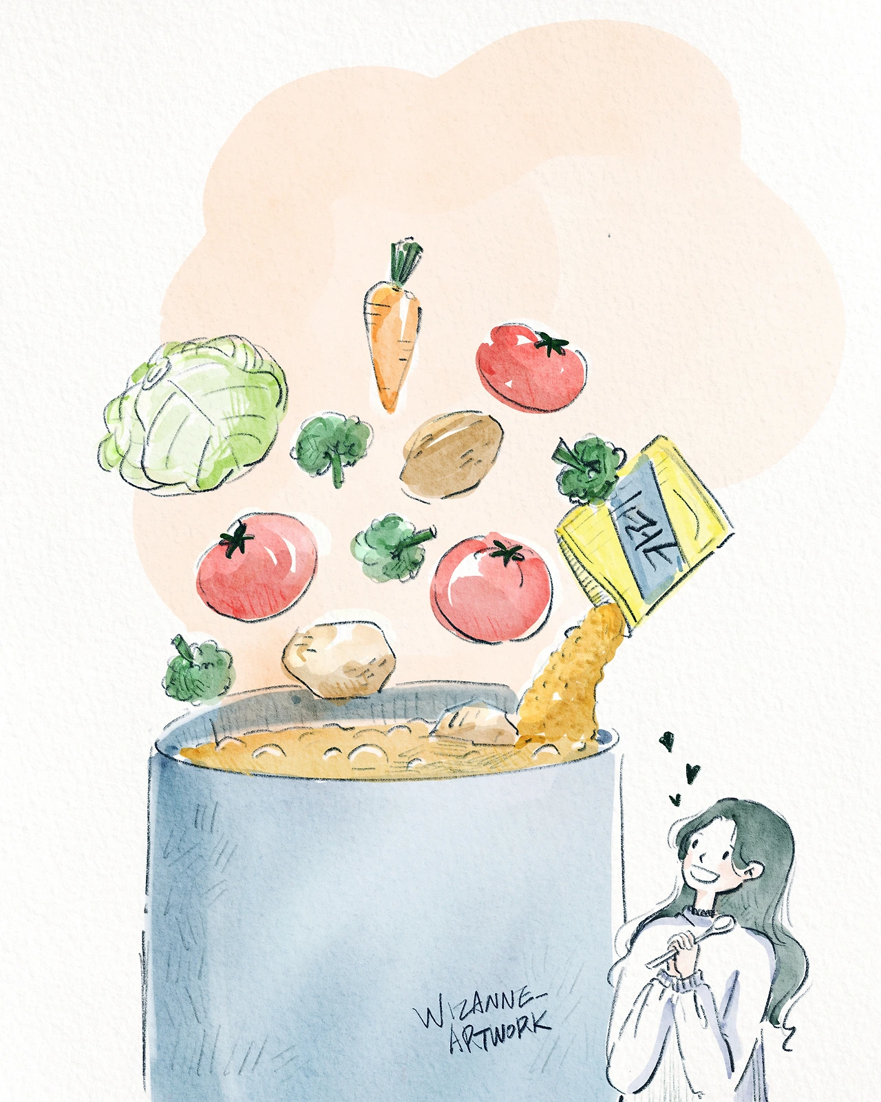 감자, 브로콜리, 당근, 토마토를 넣고 토마토가 물러질 때까지 푸욱 끓여서 먹으면 아주 맛있습니다!