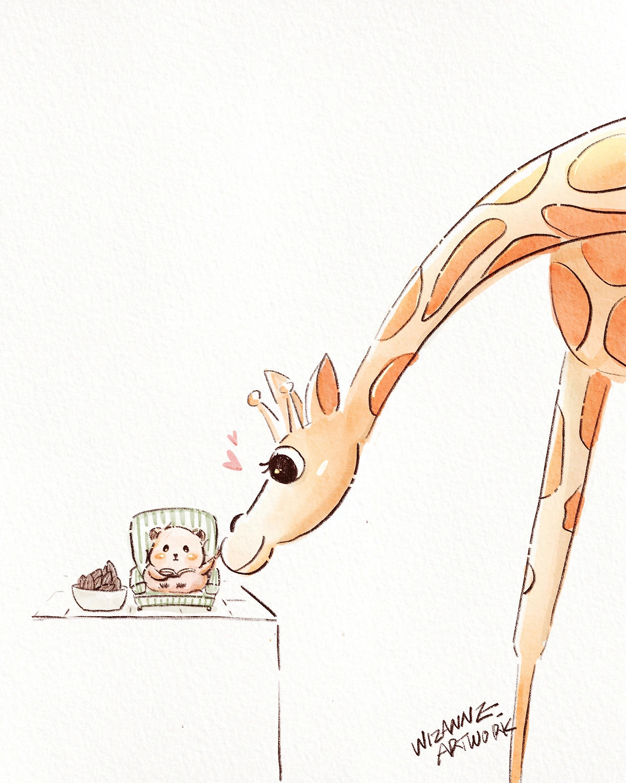 기린은 언니고 햄스터는 동생으로 11살 차이가 나는 자매인데 기린 언니는 햄스터 동생이 너무 예뻐서 뽀뽀를 하려고 쫓아다니지만