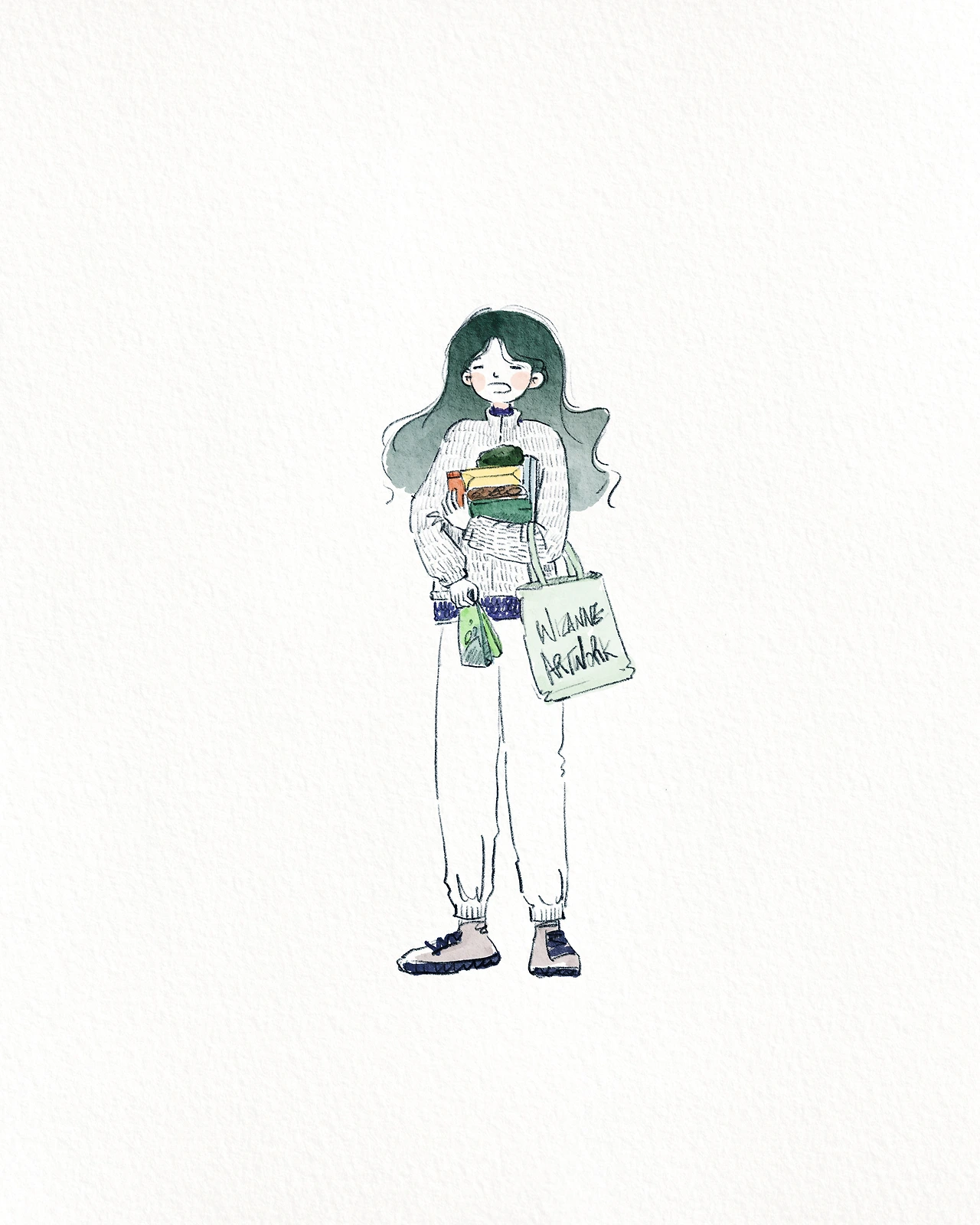 마트의 마법에 걸려 결국 에코백을 가득 채워 집으로 돌아옵니다.