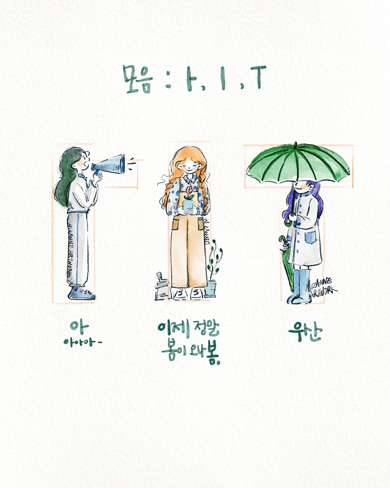 요즘 제가 한글시리즈를 하고 있는데 모음 들어가면서 저도 모르게 ‘ㅏㅣㅜ ㅔ ㅗ’를 떠올렸어요.