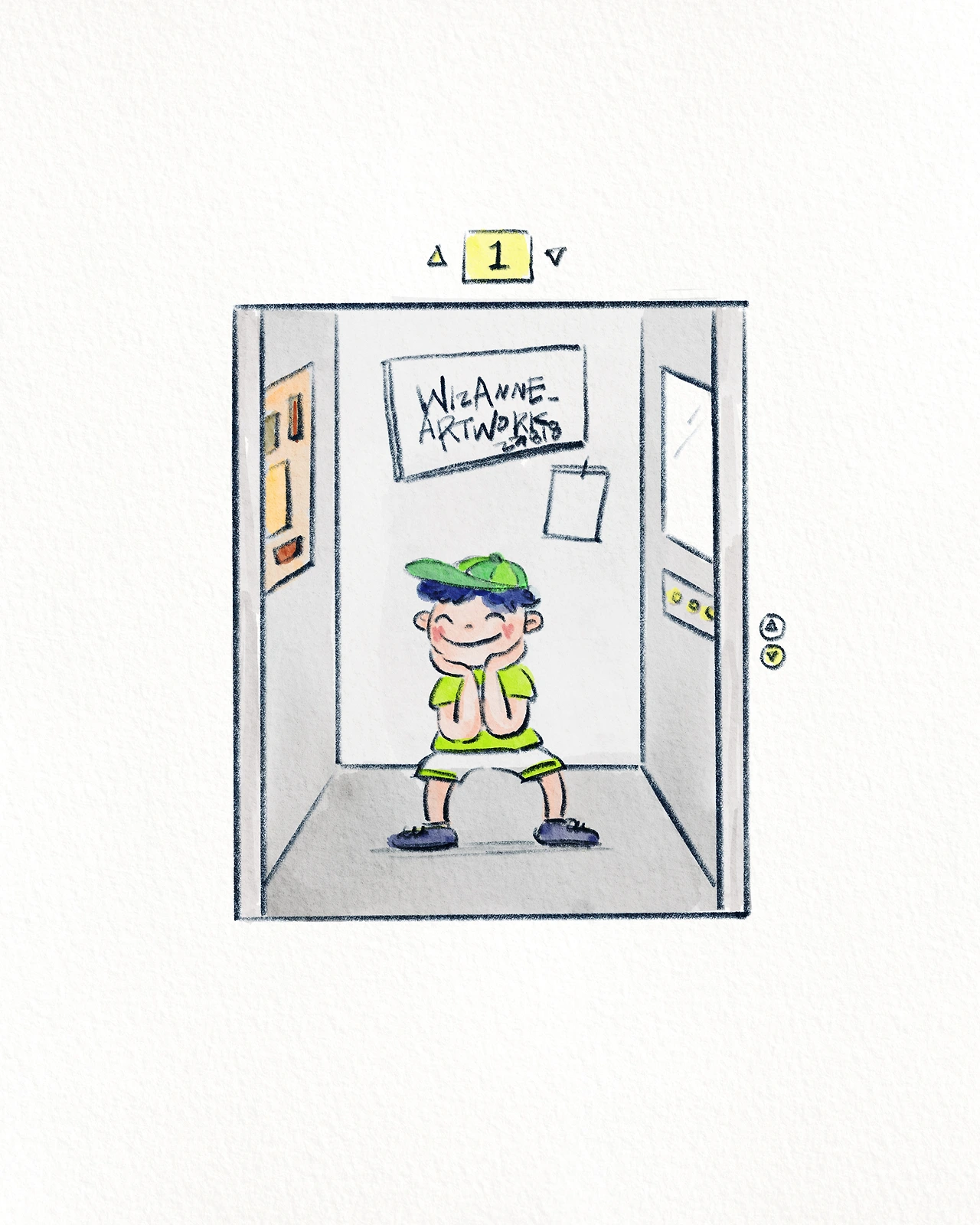 엘리베이터 문이 열리자 초1정도 되어 보이는 어린아이는 꽃받침을 하고 있어요.