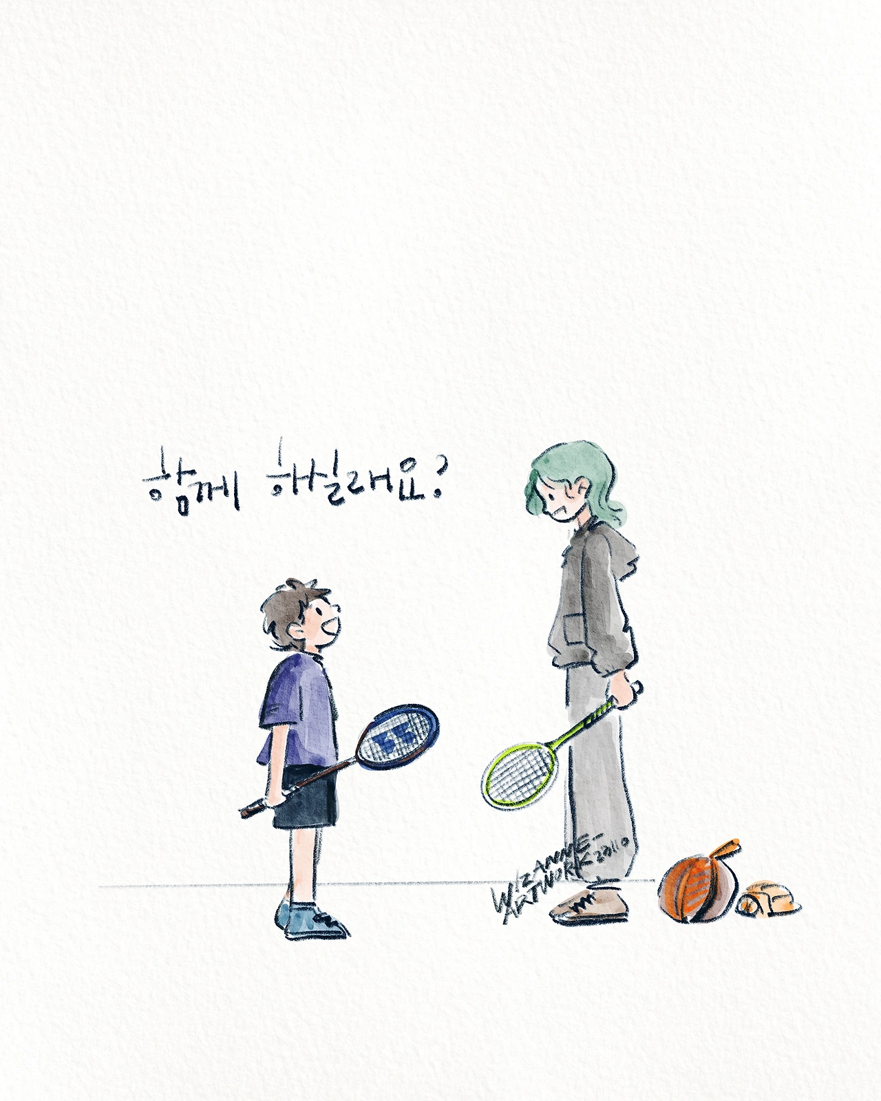 하루는 친구랑 배드민턴을 한참 치고 있는데 초등학생 같은 친구 둘이 오더니 “함께 치실래요?”라고 합니다.