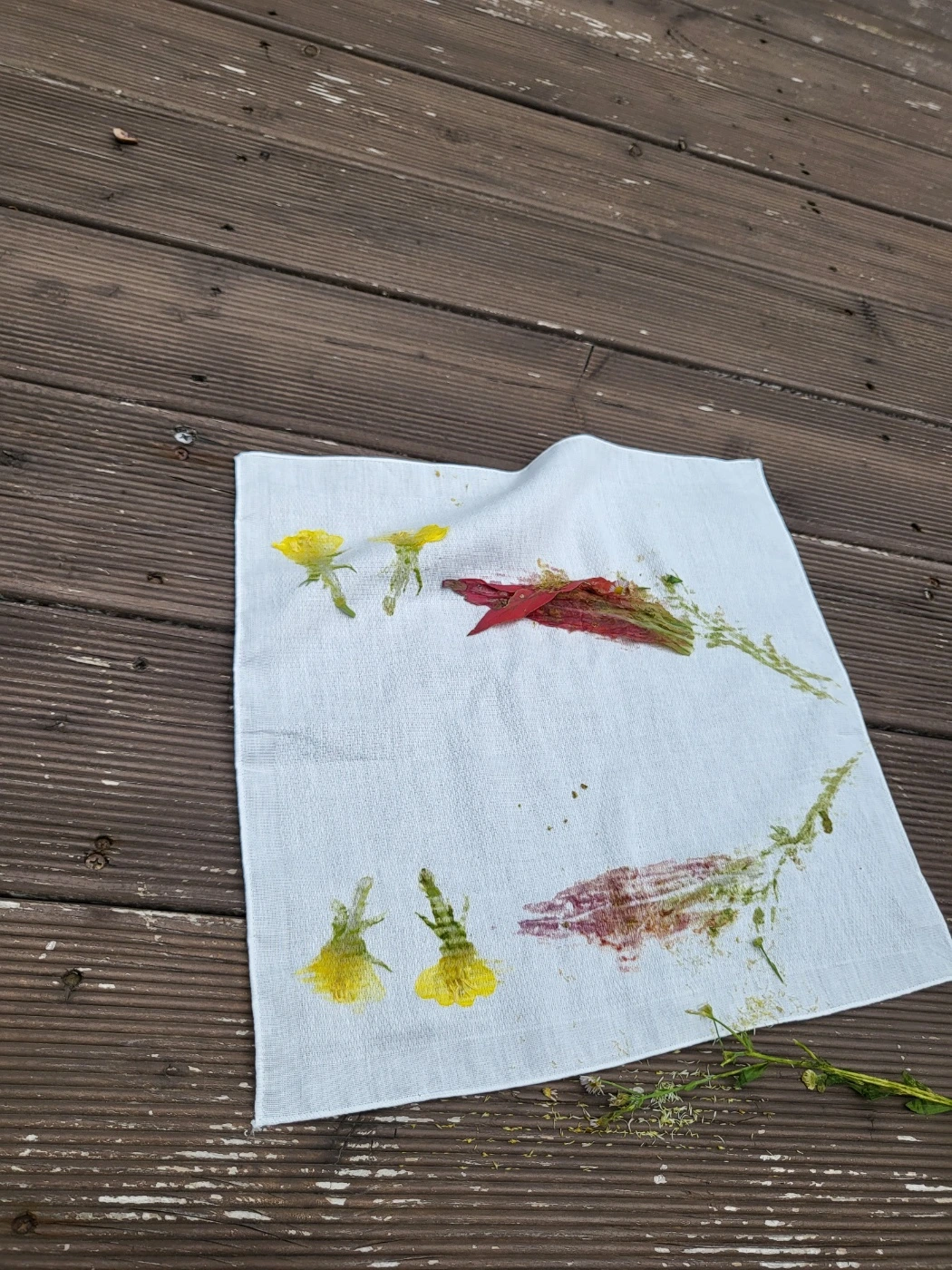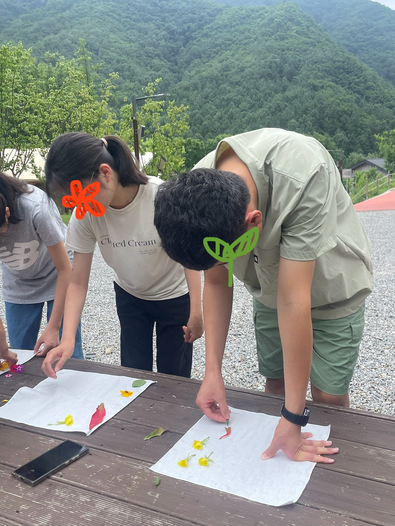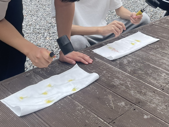 안내에 따라서 콩콩 망치질을 하니 덮어둔 손수건 위로 예쁜 색색깔의 물이 올라왔다. 노란 달맞이꽃 여러 개를 간격을 두고 물들여 판매해도 살 것 같은 퀄리티의 손수건이 탄생하기도 하고, 각기 다른 꽃과 잎으로 하나의 꽃을 그린 손수건, 나비처럼 보이는 손수건 등 너무나 매력 있던 작품들이 나왔다. 버릴 게 하나도 없었던 게 신기했다. 한 명 한 명에게 구체적인 반응을 하던 중 한 아이가 말했다.