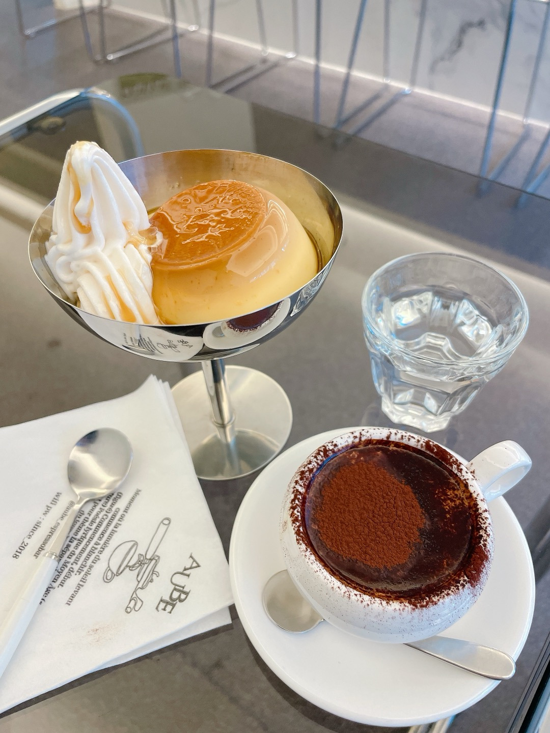 과연 잘한 선택일까, 아냐 먹어보자, 오늘 밤 못 자는 거 아니야? 음 그럴지라도 시도해 보자. 캐러멜 푸딩은 맛있을 거야... 그나저나 이제 뭐 하지? 혼자서 보내는 시간에 대한 불안(?)이 다시 들 때 즈음 동그랗고도 귀여운 에스프레소 잔에 담긴 피에노와 차가운 스테인리스 잔에 둥실 떠있는 푸딩 그리고 소주잔 같은 크기의 물 한잔이 나왔다. 피에노는 저어 마시는 게 맛있다는 말에 듬뿍 올라간 카카오가루와 커피크림을 휘휘 저었다. 짙고 깊은 갈색이 크리미한 땅콩버터 색으로 변하는 과정을 보며 묘하게 도파민이 생성되는 듯했다. 스푼에 닿는 질감이나 스푼이 움직이는 속도에 저항을 주는 끈적이는 점성도 내 생각과 달랐다. 뭐야, 무슨 맛일까. 아메리카노도 쓴데 물을 타지 않은 에스프레소는 아주 쓰고 탄 맛이 가득할 거라 생각했던 거다. 그러나 처음 만난 에스프레소 메뉴인 피에노는 달콤, 부드러움이 가득했다. 앙증맞은 컵에 맞게 한 모금 마시고 내려놓았지만 곧바로 한 모금을 마셨다. 너무 맛있어서. 그리고 올라오는 텁텁함에 물 한 모금 마시고 캐러멜 푸딩을 맛보았다. 이야, 아이스크림이 더해지니 시원하고 찐덕하게 달콤하고 다했다.