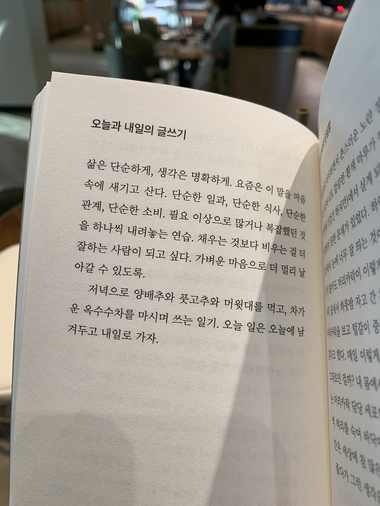 미니멀 라이프를 지향하며 조금씩 변화하는 내 삶의 모습이 마음에 들었다. 많은 것을 가져야 행복한 것이 아니라 내게 무엇이 중요한지 알고 그것에 집중하며 그 외의 것은 덜어내는 것이 중요하다는 걸 깨달았다. '단순함'이라는 가치는 소비/자산 관리, 업무, 관계, 시간 활용, 목표 등 삶을 둘러싼 모든 영역에 적용할 수 있었다.