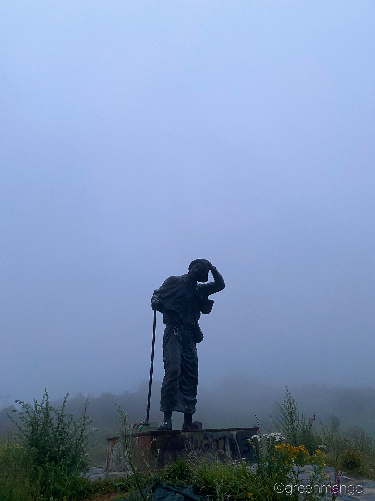 세상이 온통 뿌옇다. 발 끝만 보며 길을 내어 나아간다. 유재하의 ‘가리워진 길’이 듣고 싶어지는 날이다. 안개 자욱한 인적 없는 산길에서 마주친 순례자상이 왠지 오싹하다. 인간이 아니라 다행이란 맘이 드는 것이 참 아이러니하다.