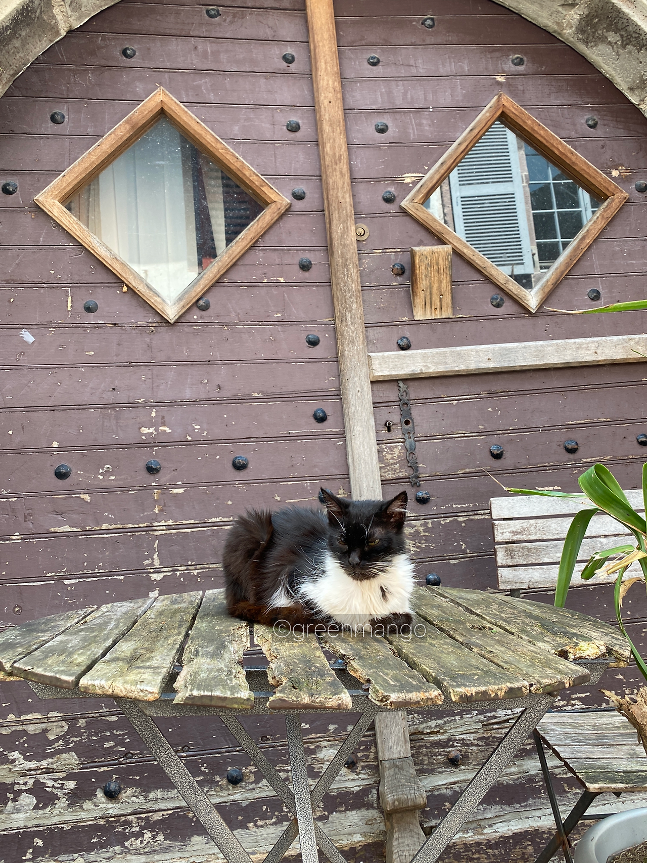 길거리의 빈티지한 나무 탁자 위에는 턱시도 고양이 한 마리가 반쯤 감긴 눈으로 식빵을 굽고 있다.