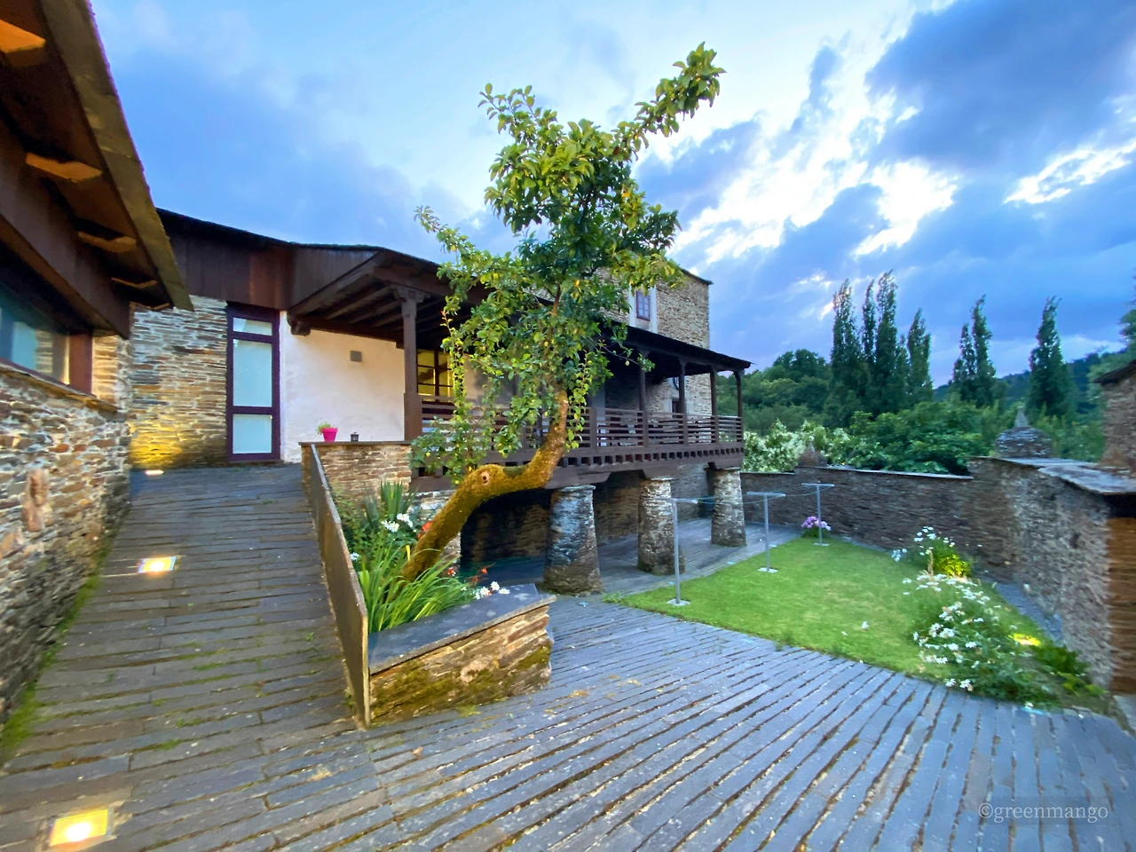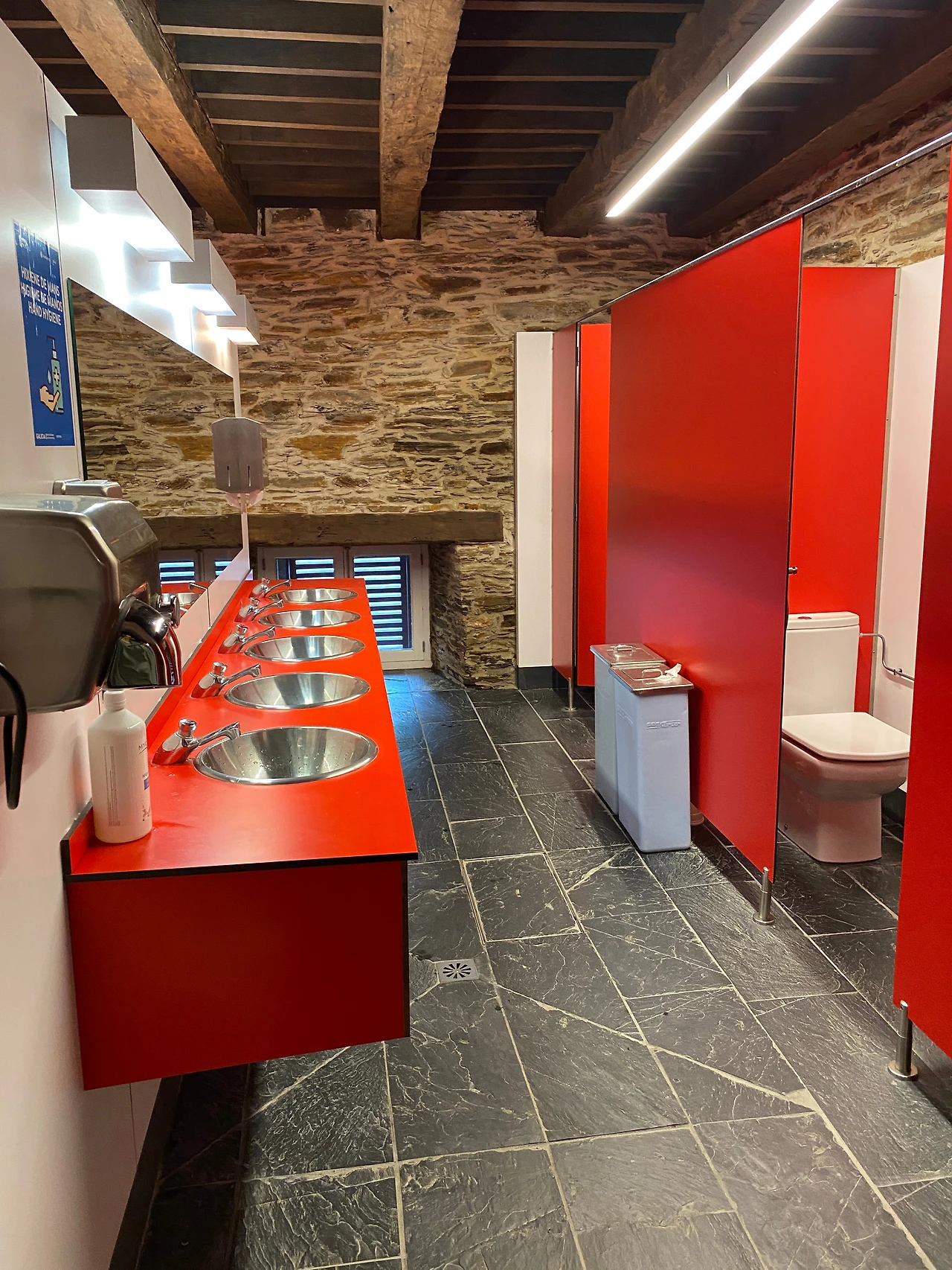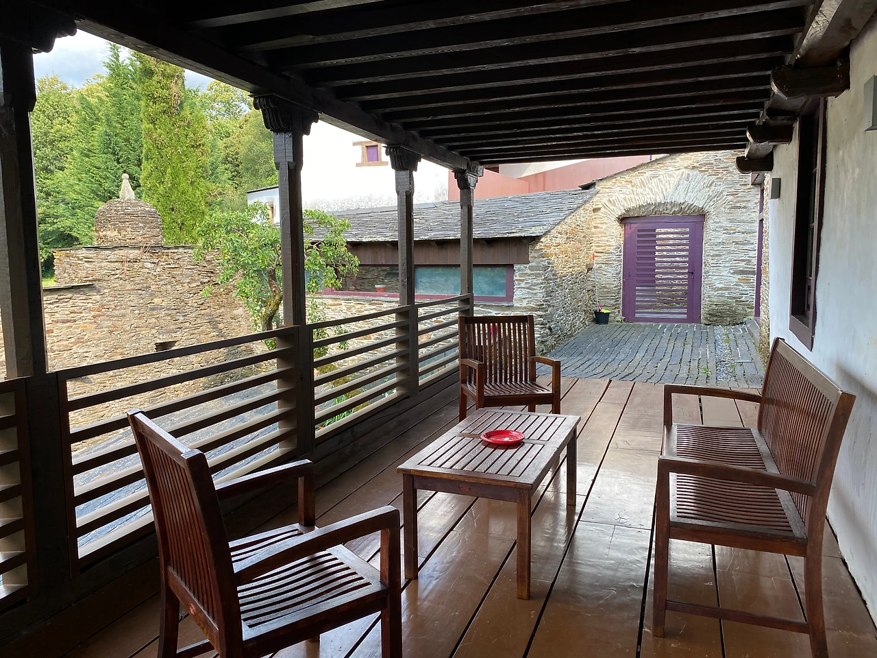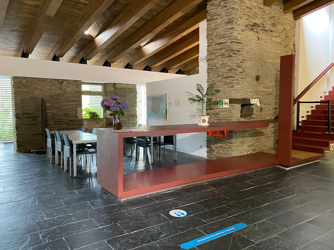 외관은 낡아 보이지만 내부는 모던하게 리노베이션 되어 있었다. 여느 대도시의 공립알베르게에 뒤지지 않는 시설이다. 건물 안으로 들어가니 우측으로 리셉션 오피스가, 정면에는 널찍한 로비에 다이닝 공간과 주방이 벽을 사이에 두고 나란히 붙어 있다. 조화롭게 어우러진 하얀 회벽과 베이지톤 석벽 위로는 호두나무 빛깔 서까래가 멋스럽게 늘어서 있다. 같은 색조의 원목으로 꾸며 놓은 테라스에는 아래층 정원으로 이어지는 데크가 깔려 있다.