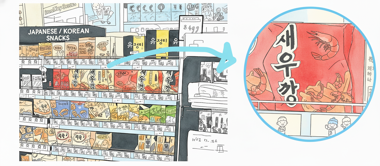 편의점 진열대에서 새우깡을 발견했을 때, 순간 한국의 밤으로 돌아간 듯했다. 반가움에 손을 뻗었지만, 1,400원이라는 가격표가 그 환상을 단숨에 깨뜨렸다. 십 수년 전 그 금액은 꽤 비쌌다. 우리는 그것을 사는 대신 사진 한 장을 남겼다. 가질 수 없는 것을 기억하는, 가장 조용한 방식이었다.