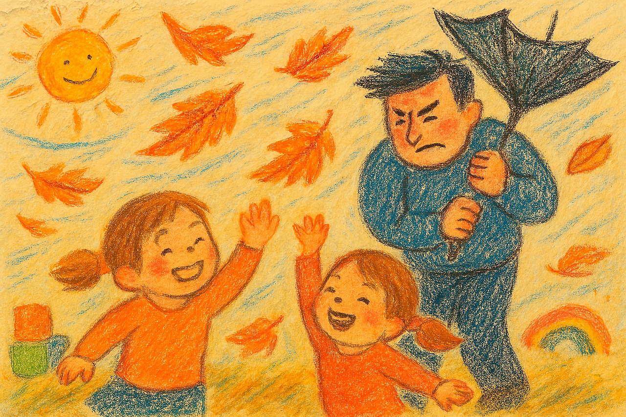 "얘들아, 오늘 강한 바람이 부니깐 외투를 잘 챙겨 입어!"