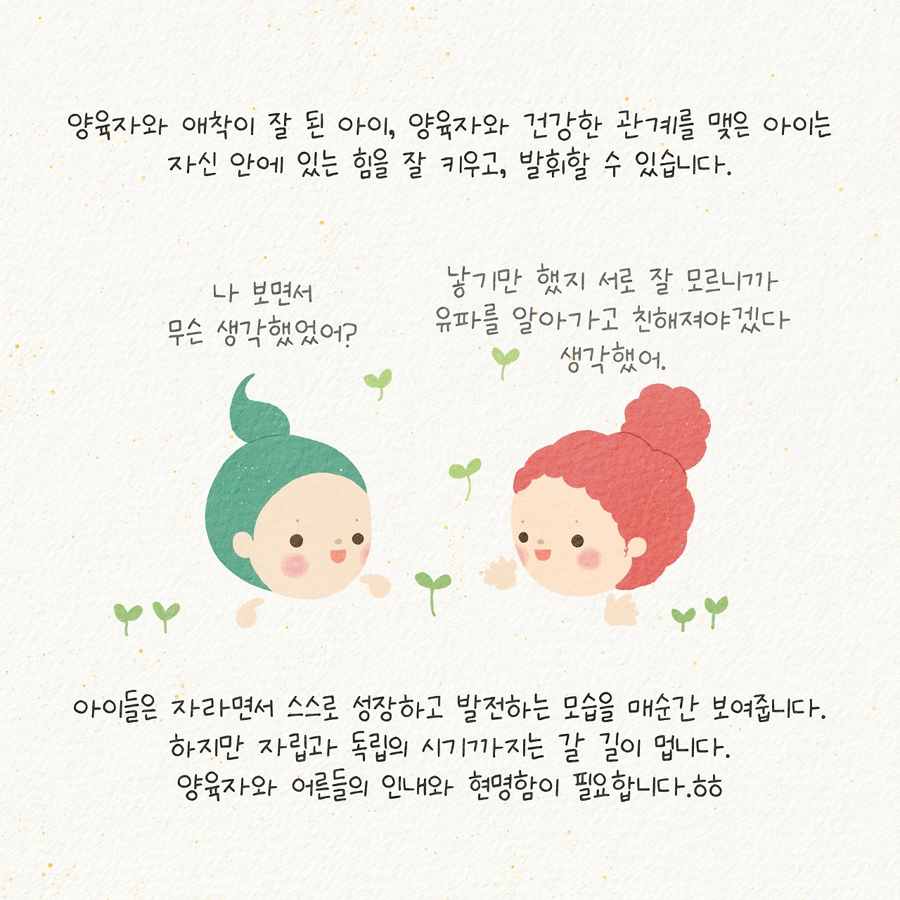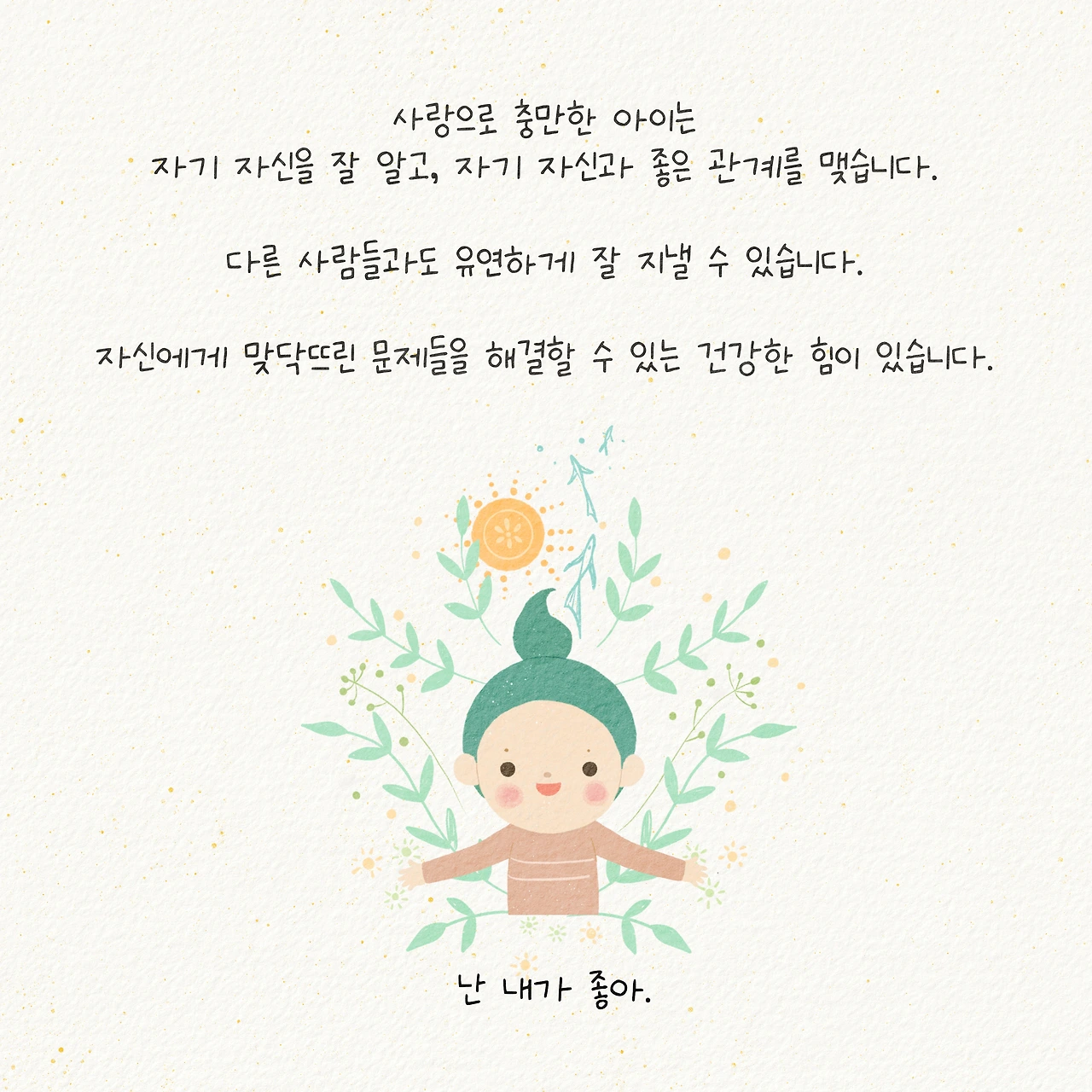 아이에게 좋은 자극, 좋은 경험, 좋은 환경이 될 수 있도록 양육자가 자신을 돌아보는 일은 절대적으로 필요하고 중요한 일입니다.