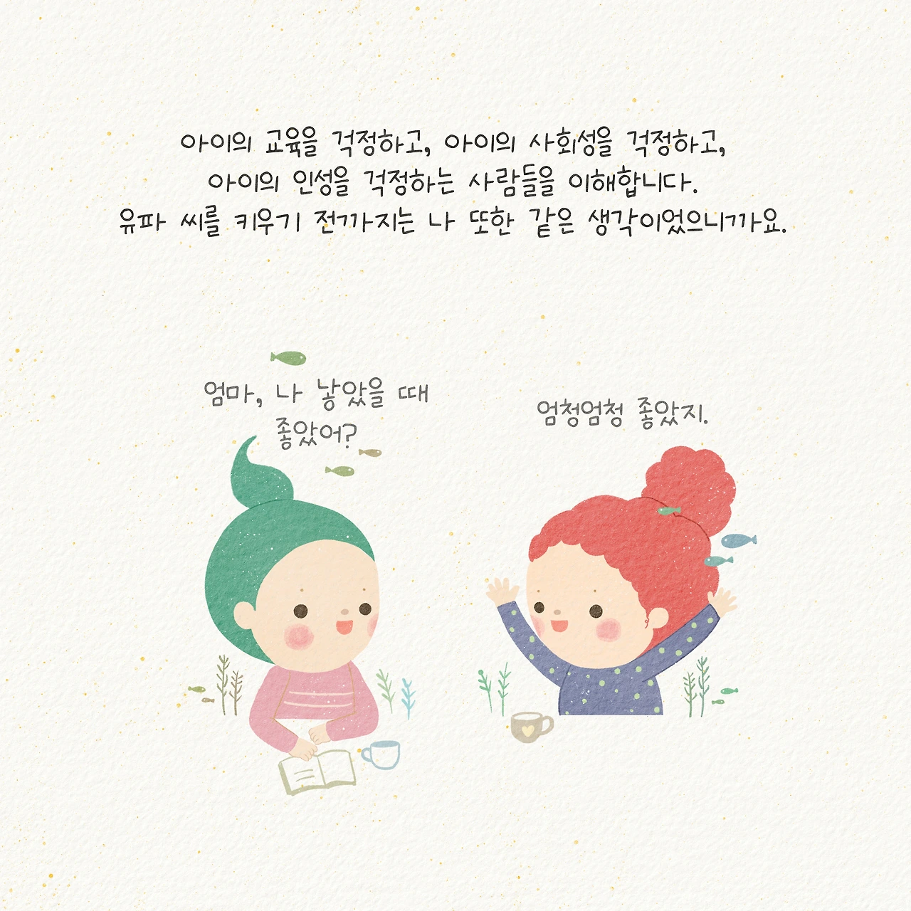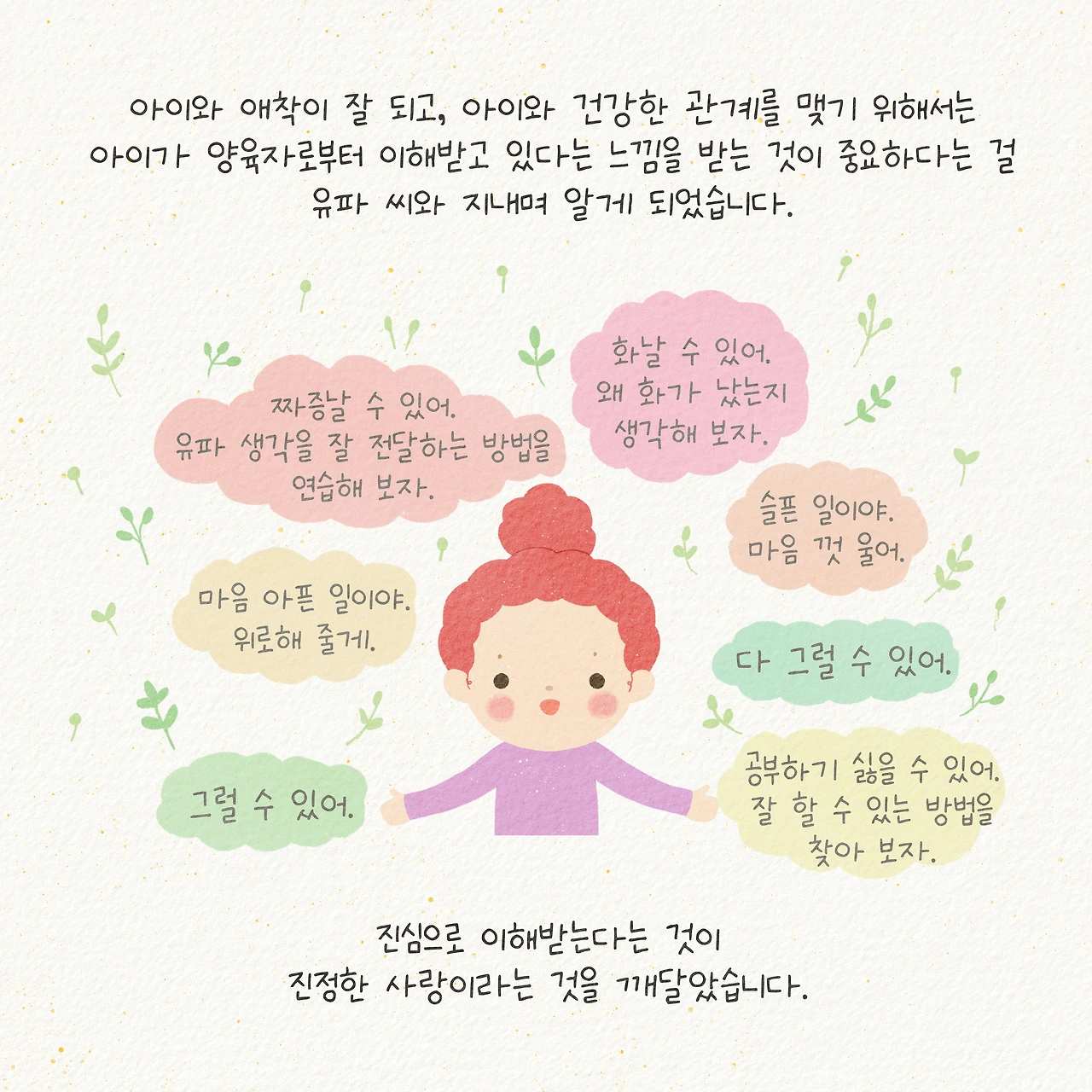 유파 씨를 키우며 아이 안에 ‘스스로’ 건강하게 크고자 하는 힘, 배우고자 하는 힘, 사람들과 잘 어울려 지내고자 하는 힘이 있다는 것을 알게 되었습니다. 그리고 아이 안에 있는 이 힘들을 잘 키우기 위해서는 양육자와의 건강한 관계 맺음, 애착이 중요하다는 것을 다시금 깨달았습니다.