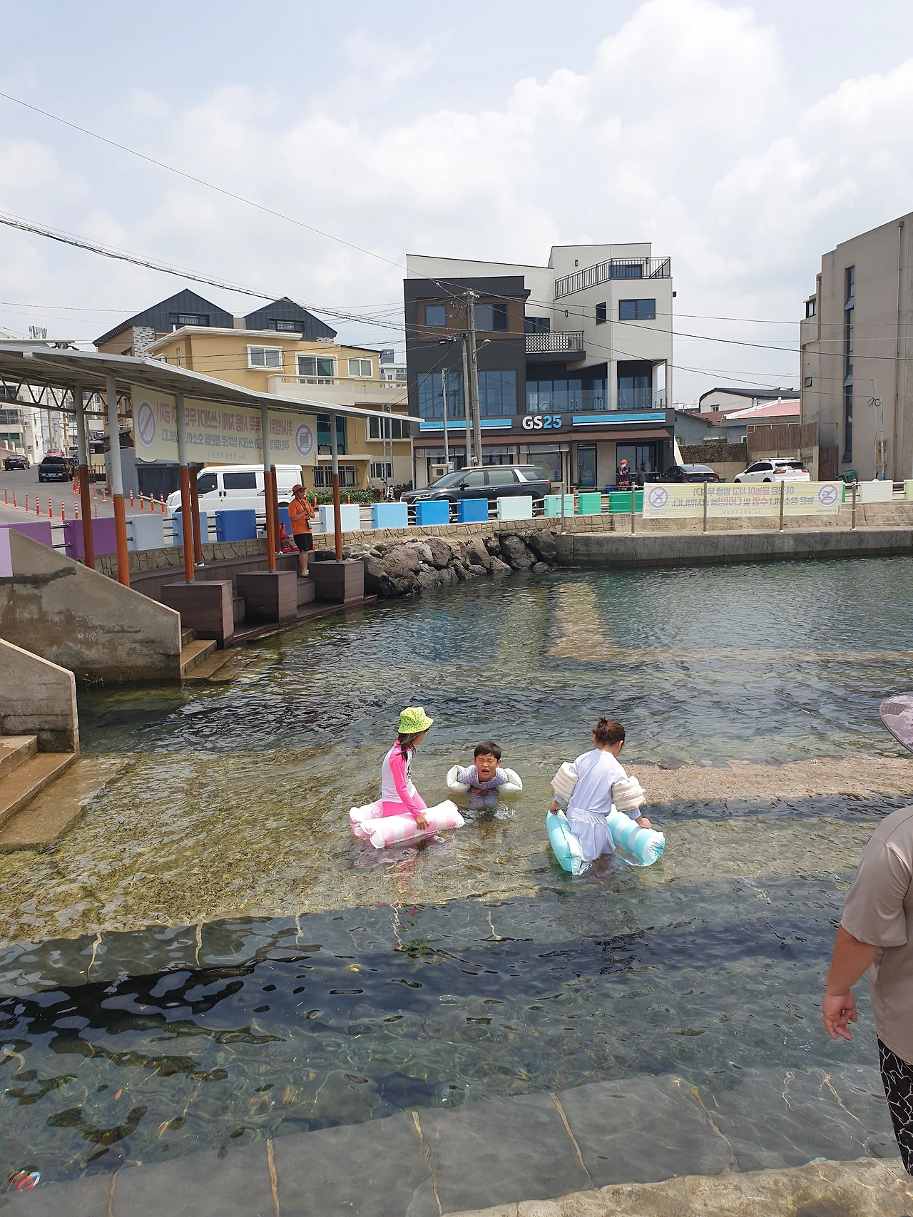 도착해서 보니 할머니 한분이 빨래를 하고 계셨고 일 마치고 집에 가는 길에 들르셨다며 장화와 장갑을 씻으시는 아주머니도 계셨다. 샛도리물 그늘 쉼터에는 동네 할머니와 아저씨들이 발을 담그고 있었다. 스노클링 장비까지 갖추고 수영하는 사람, 연인과 함께 온 사람, 개 끌고 산책 온 동네 사람들.. 짧은 시간에 다양한 사람들이 스쳐갔다.